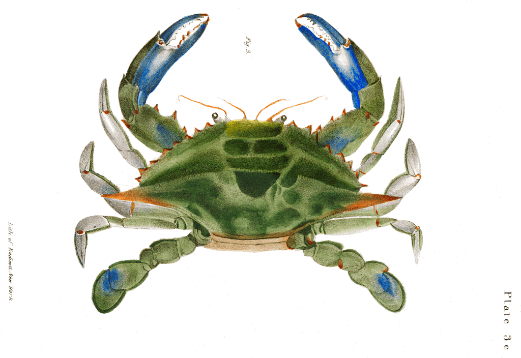 This image is a vintage illustration of a blue crab from Zoology of New York.