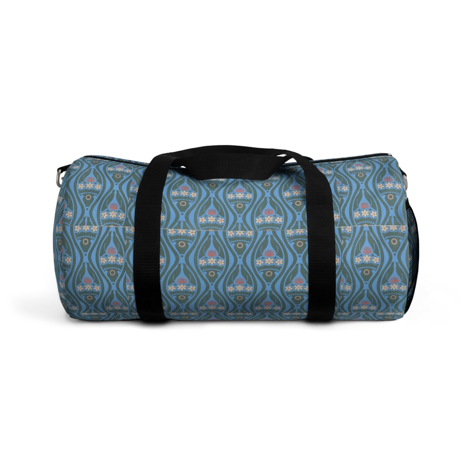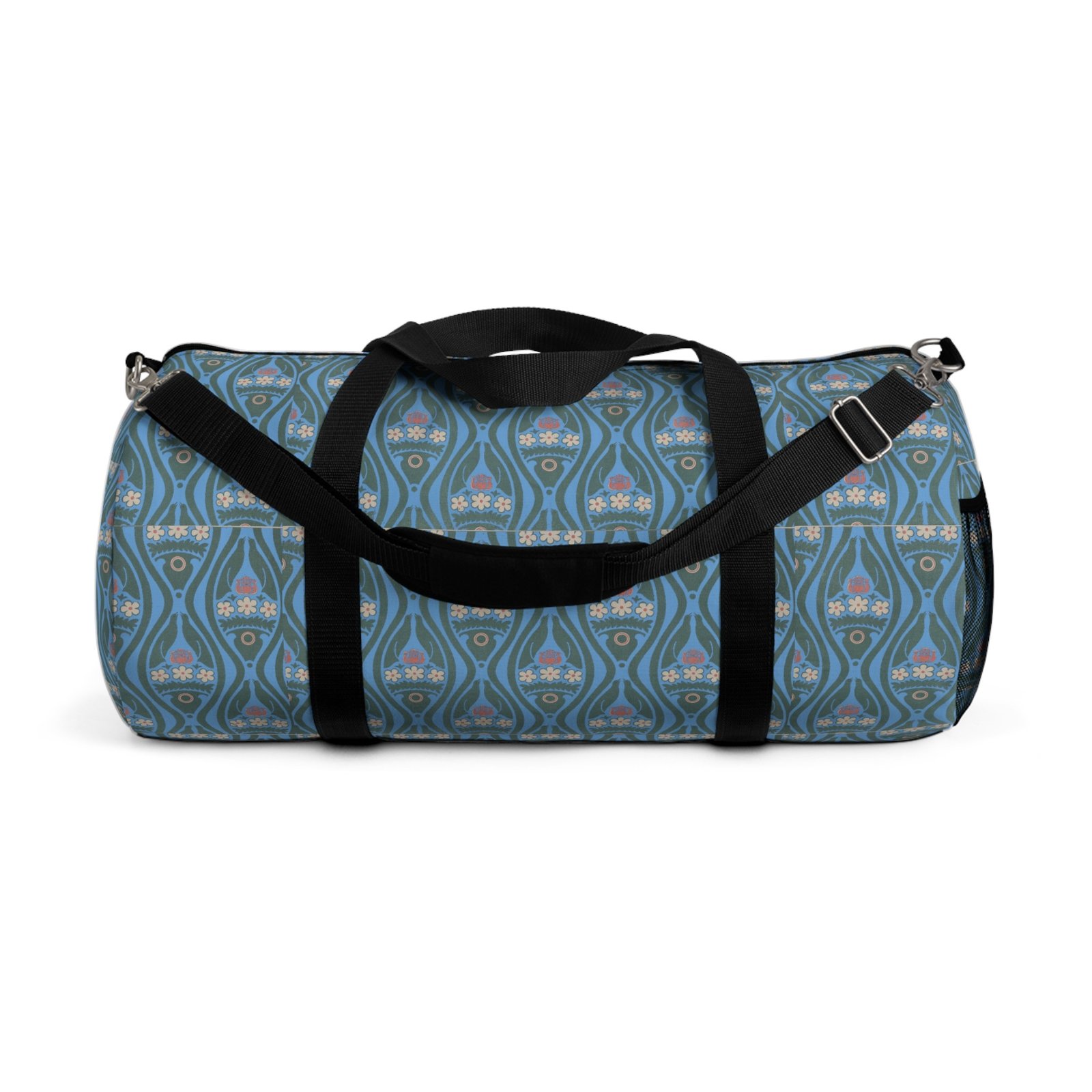 This roomy duffel brings soft vintage charm to every weekend away. The muted teal pattern feels like a well-loved travel journal — calm, collected, a little romantic. Slide the adjustable shoulder strap over your coat, tuck a book and a sweater into the main compartment, and know the interior zipper pocket keeps small essentials organized and the sewn name tag keeps it personal. Built from tough polyester Oxford, it stands up to repeated trips while still feeling light and easy to carry. It’s the kind of bag that turns hurried train-platform moments into small, steady rituals.
