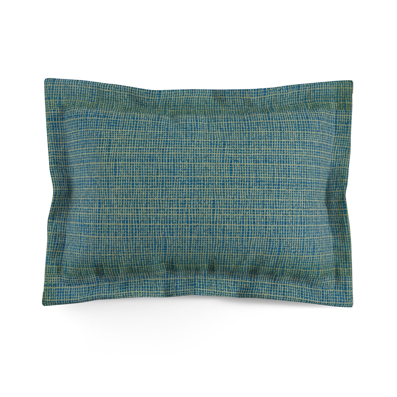 A soft, woven microfiber sham in a muted teal crosshatch pattern that brings quiet texture and comfort to a relaxed bedroom or cozy reading nook. The brushed microfiber face offers a gentle, lightweight touch while the cream-colored back keeps the overall look clean and layered. An easy double-layer envelope closure tucks a pillow insert securely inside, keeping lines smooth and the sham feeling effortlessly lived-in. It reads like a well-loved linen — subtle, textured color that blends with natural wood tones and neutral bedding. Slip it onto a lumbar or standard pillow to add depth and a calm, collected vibe to evenings spent with a book or slow coffee.