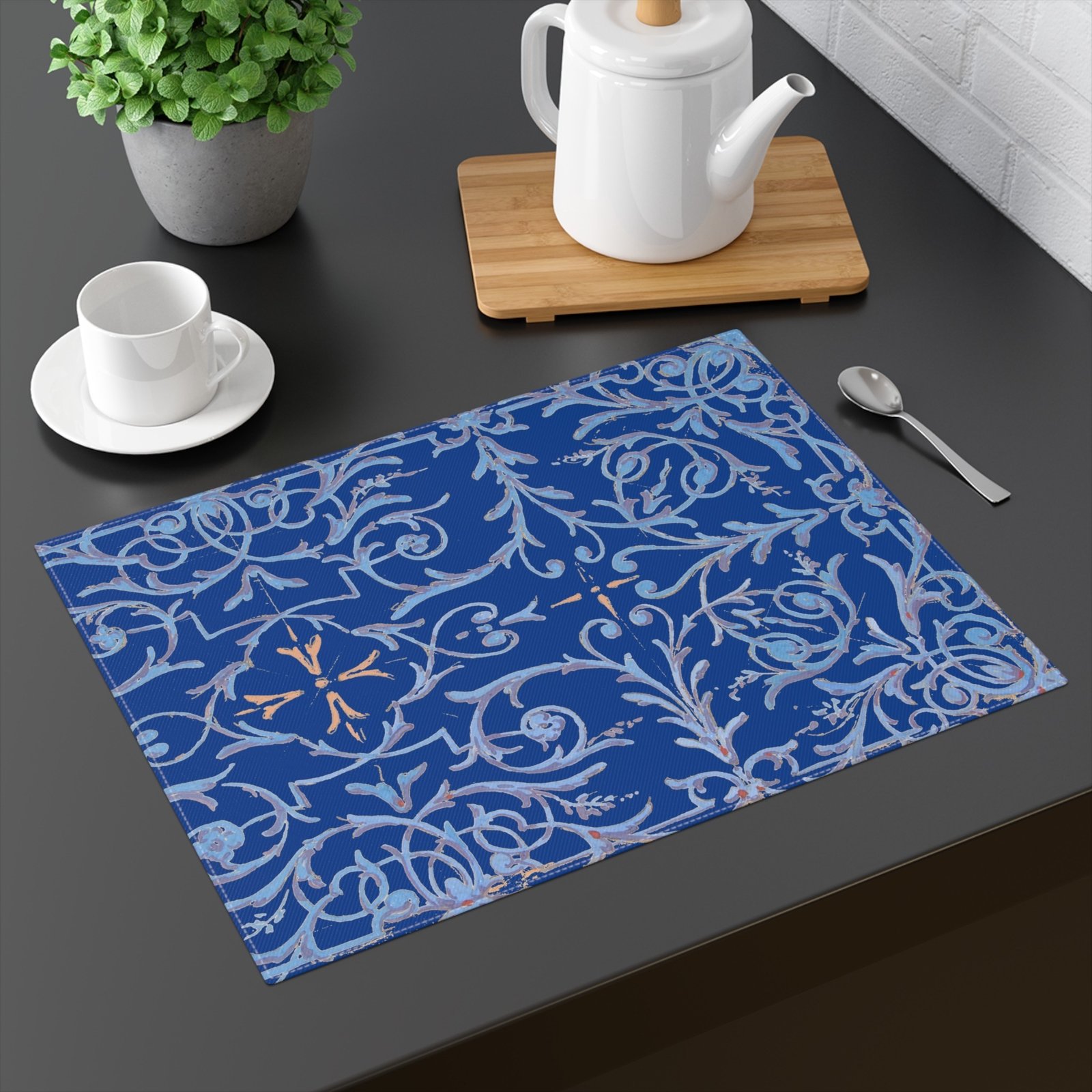 Bring a touch of old-world charm to your tabletop with this cotton twill placemat. The deep blue background is layered with hand-drawn, slightly distressed scrollwork and floral motifs in soft sky and warm peach tones — a pattern that reads both vintage and whimsically modern. The two-layer, hemmed construction gives it a pleasing weight and a lived-in look, so it lays flat and stays in place while you sip coffee or serve a casual brunch. It settles naturally into cozy kitchens and curated dining nooks, adding calm, patterned texture without shouting for attention. Use it to lengthen breakfasts at the window, to ground a tea service, or as a small stage for seasonal centerpieces during intimate gatherings.