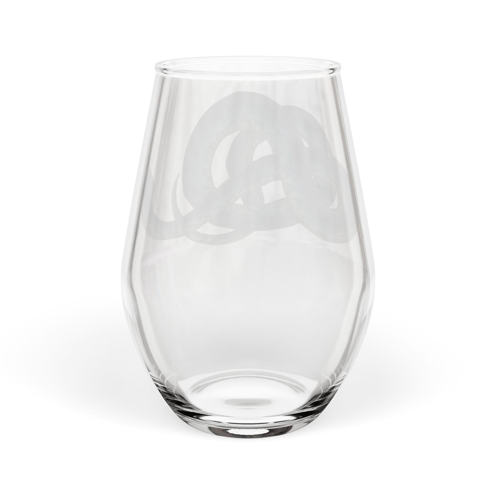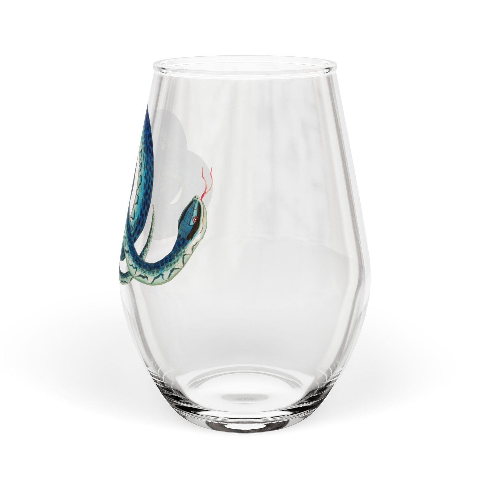 A stemless wine glass that brings a touch of ocean mystery to quiet evenings and lively gatherings. The clear 11.75 oz glass showcases a glossy, vibrant print of a teal-blue serpent-like sea creature coiling around the side — detailed scales and painterly shading make the design feel alive against the glass. Lightweight and easy to hold, this piece slips naturally into summer nights on the deck, intimate dinners, or cozy reading nooks where you sip slowly and savor the moment. The print is on one side, leaving plenty of clarity to admire your drink while the artwork catches the light. Hand wash to preserve the gloss and color vibrancy; the subtle country-of-origin mark sits on the base.