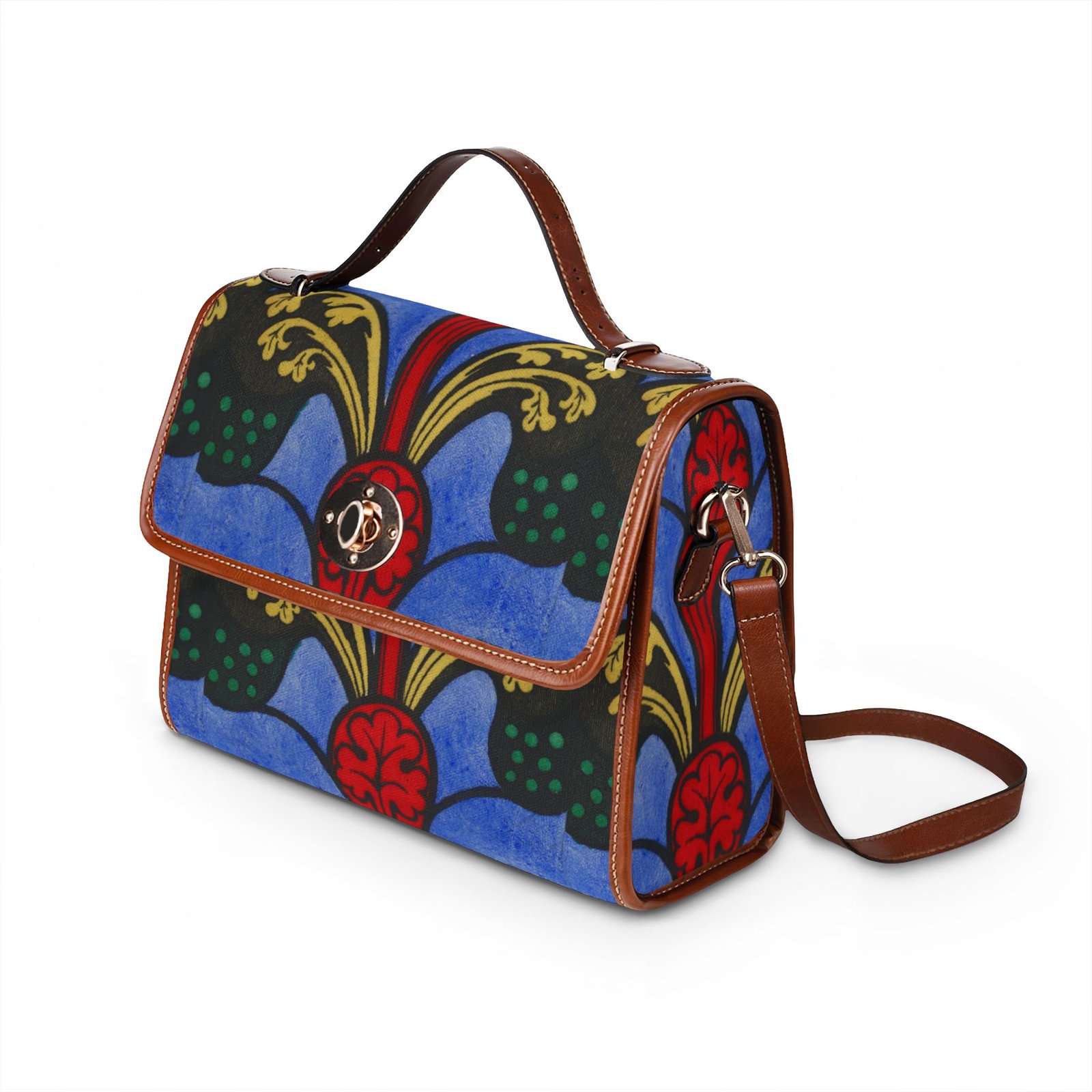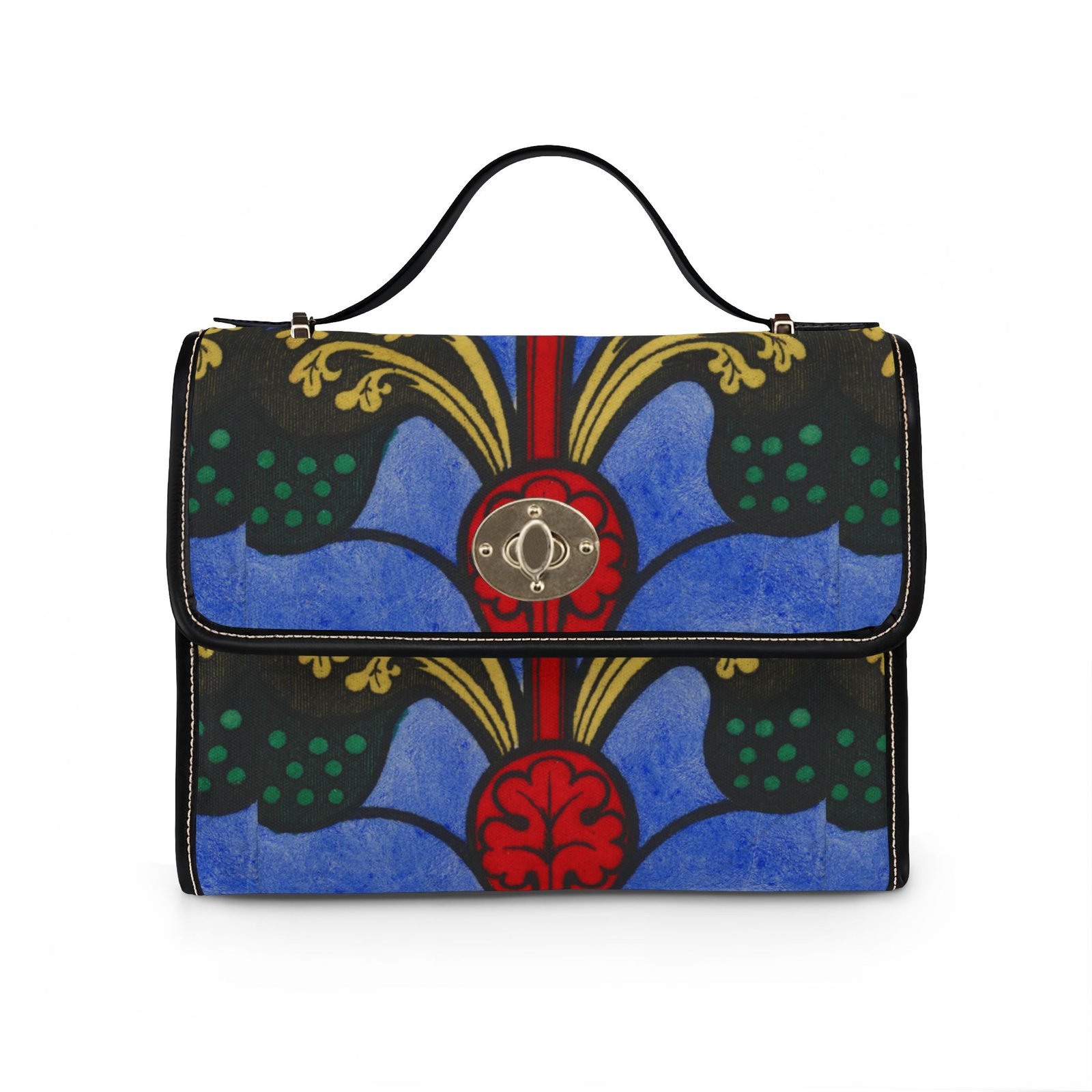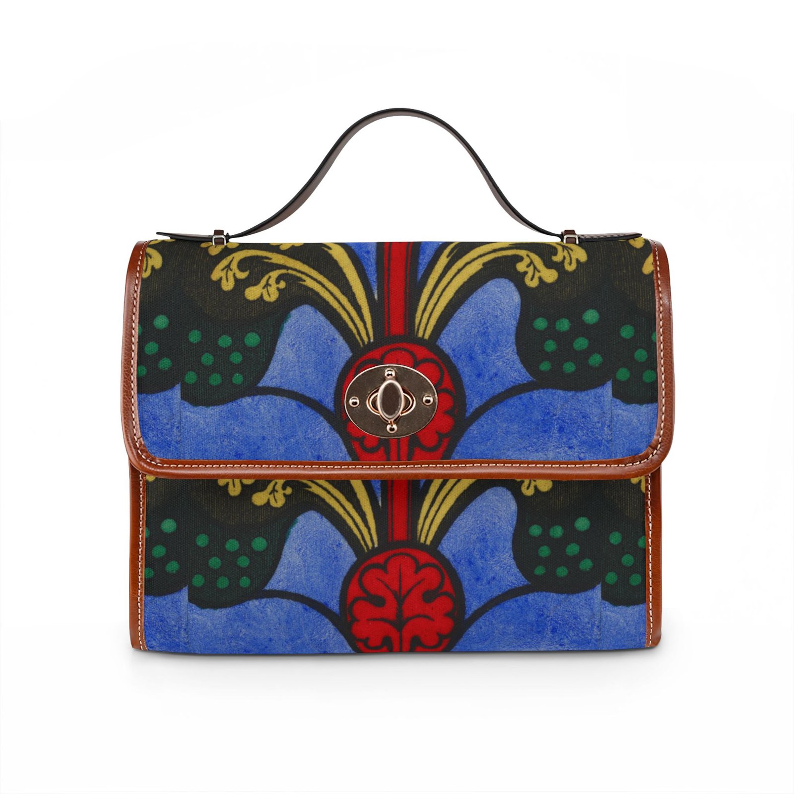 This waterproof canvas bag brings bold, artistic color to everyday life. Rich blues and deep reds form a vintage-inspired motif that stands out whether you’re commuting, traveling, or strolling through a weekend market. The structured silhouette, double PU leather handles, and neat brass hardware feel familiar and reassuring — like an old favorite with a modern, water-ready update. Inside, two pockets (one zip) keep small essentials organized. Carry it by the top handle for polished days, or swap on the removable shoulder strap for hands-free movement when you’re chasing errands or exploring the city.