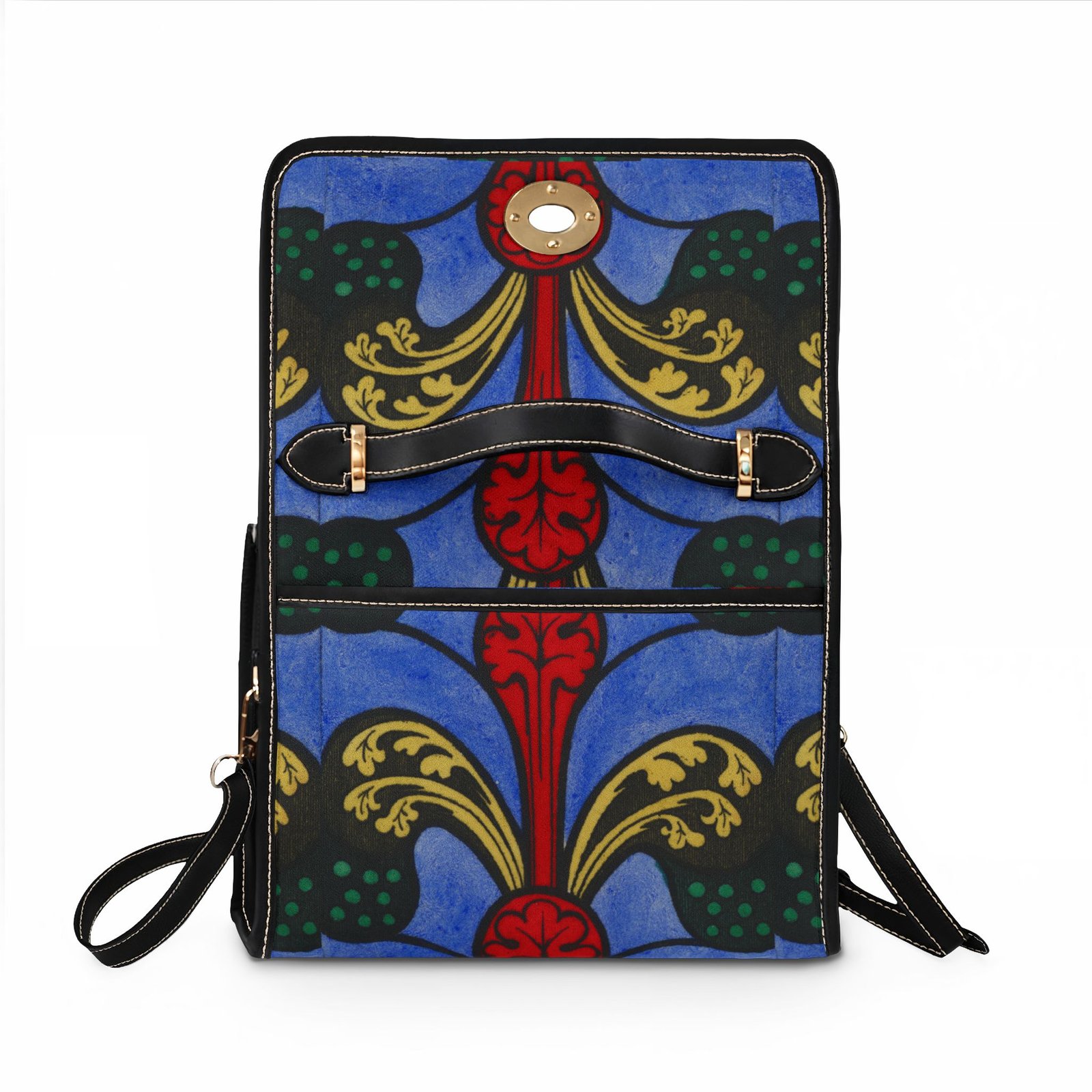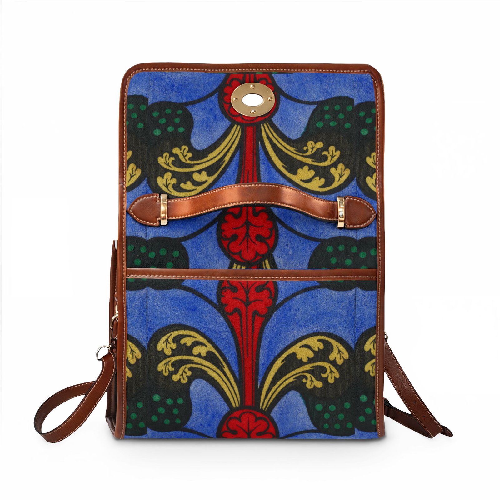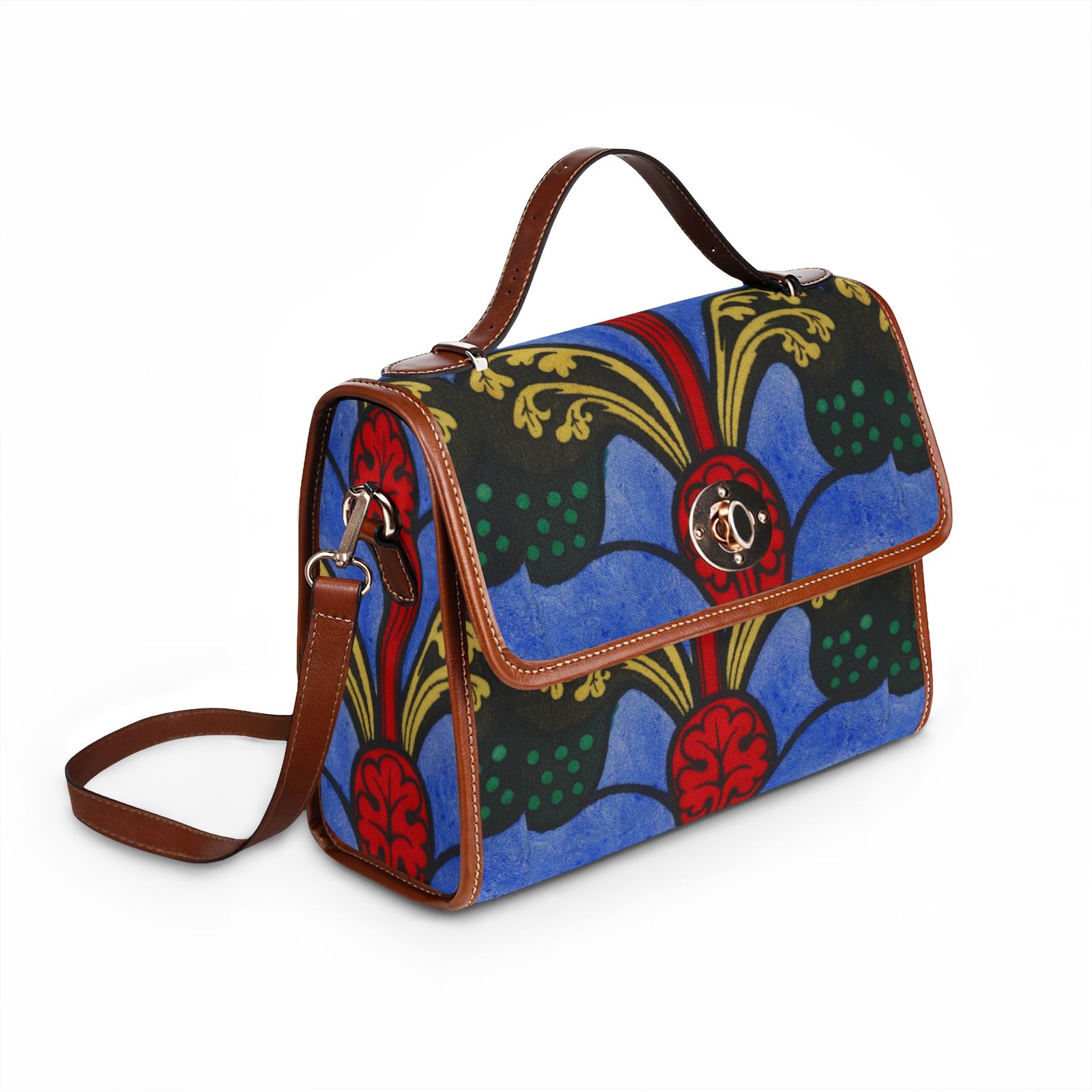 This waterproof canvas bag brings bold, artistic color to everyday life. Rich blues and deep reds form a vintage-inspired motif that stands out whether you’re commuting, traveling, or strolling through a weekend market. The structured silhouette, double PU leather handles, and neat brass hardware feel familiar and reassuring — like an old favorite with a modern, water-ready update. Inside, two pockets (one zip) keep small essentials organized. Carry it by the top handle for polished days, or swap on the removable shoulder strap for hands-free movement when you’re chasing errands or exploring the city.