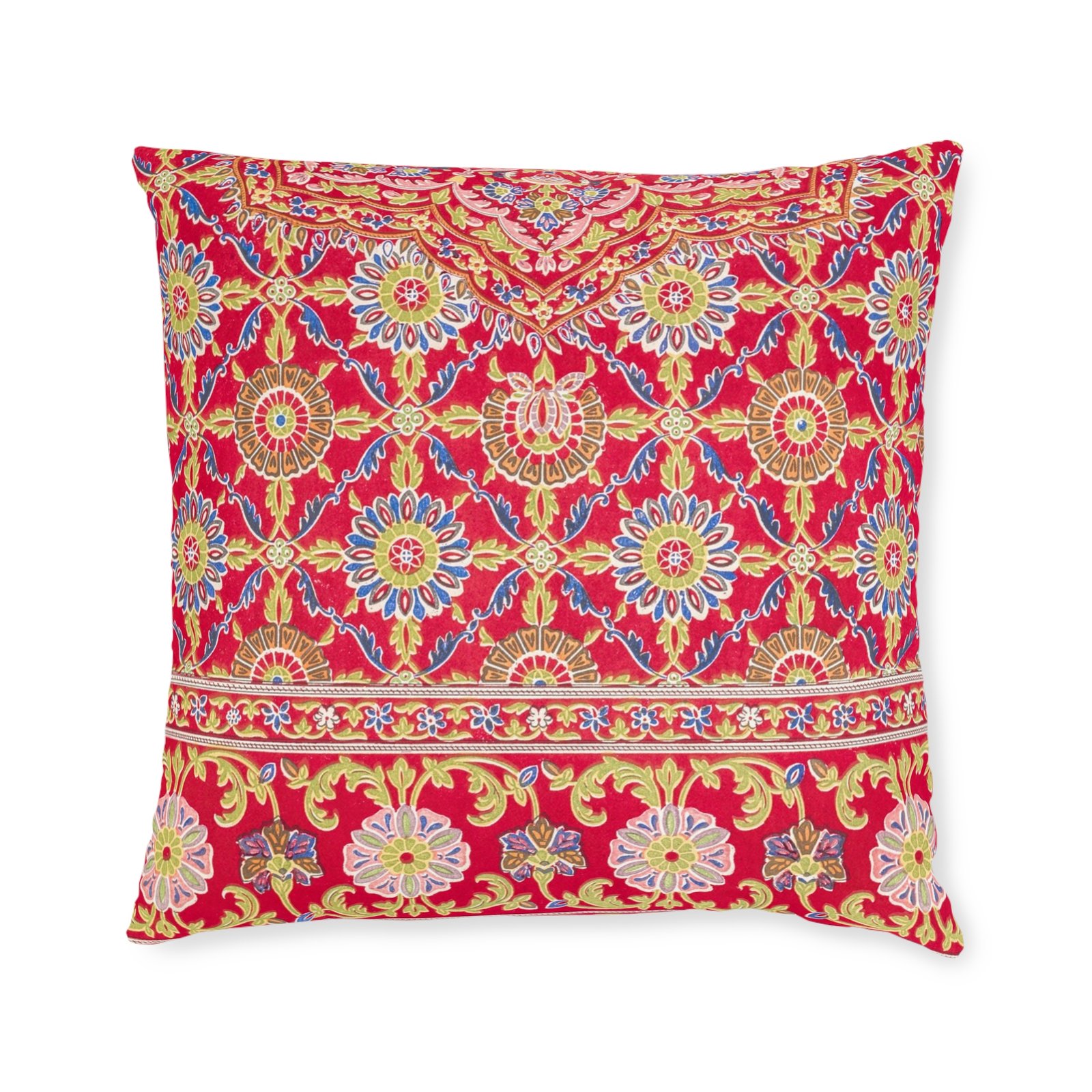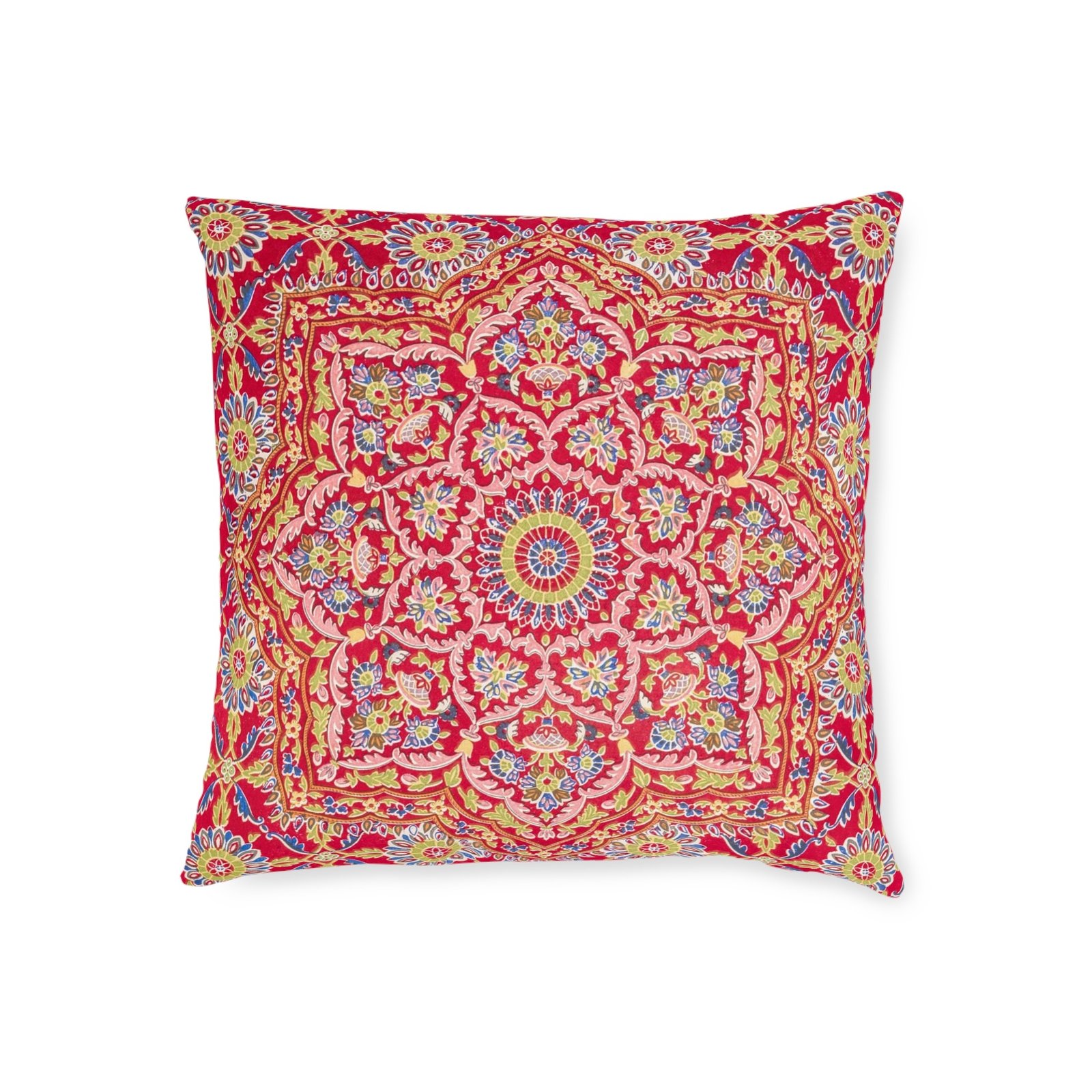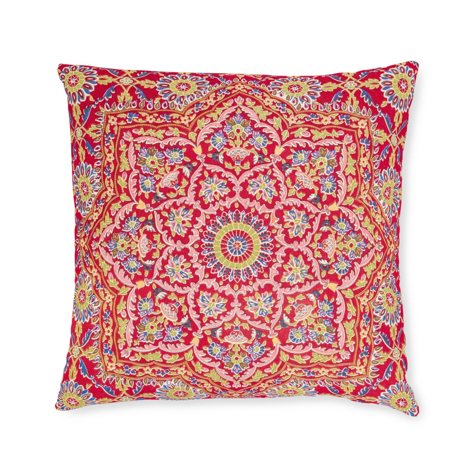 Bright, plush square pillow with a richly detailed, mandala-inspired pattern in warm pinks, golds, and soft blues. The faux-suede polypropylene cover feels velvety and holds its shape, while a fluffy polyester insert keeps the pillow soft and supportive. Double-sided printing means the vibrant design shows from every angle, and a concealed zipper keeps the look seamless while allowing easy removal for care. This cushion adds a lively, handcrafted vibe to living rooms, reading nooks, or layered on a bed — bringing color, texture, and a cozy, collected atmosphere to everyday spaces.