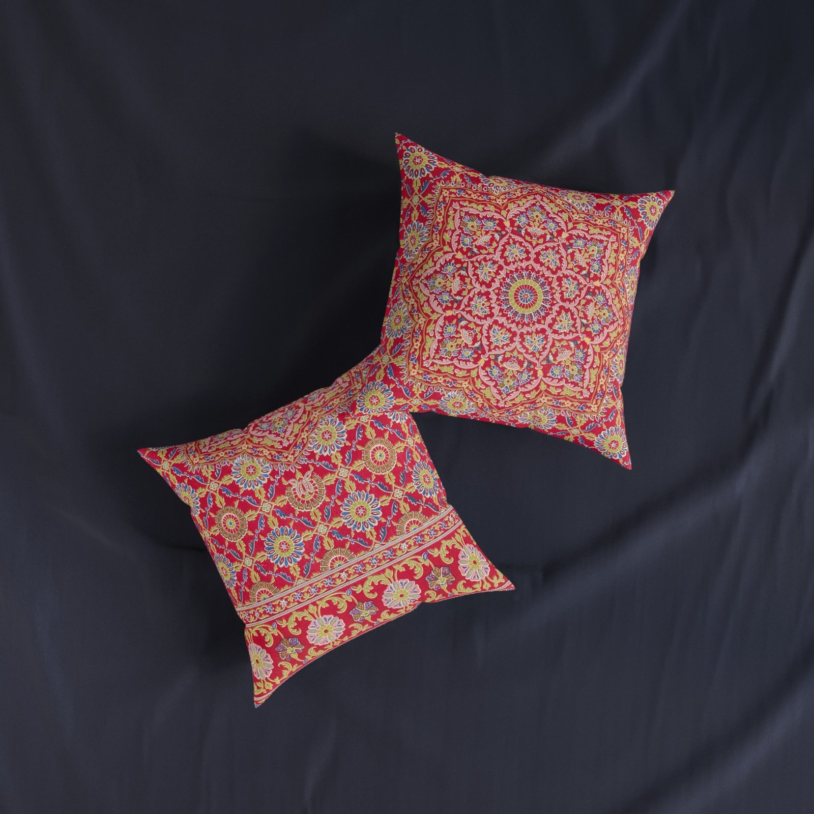 The piece showcases traditional Indian craftsmanship with intricate, multi-colored floral and geometric patterns on a red background.