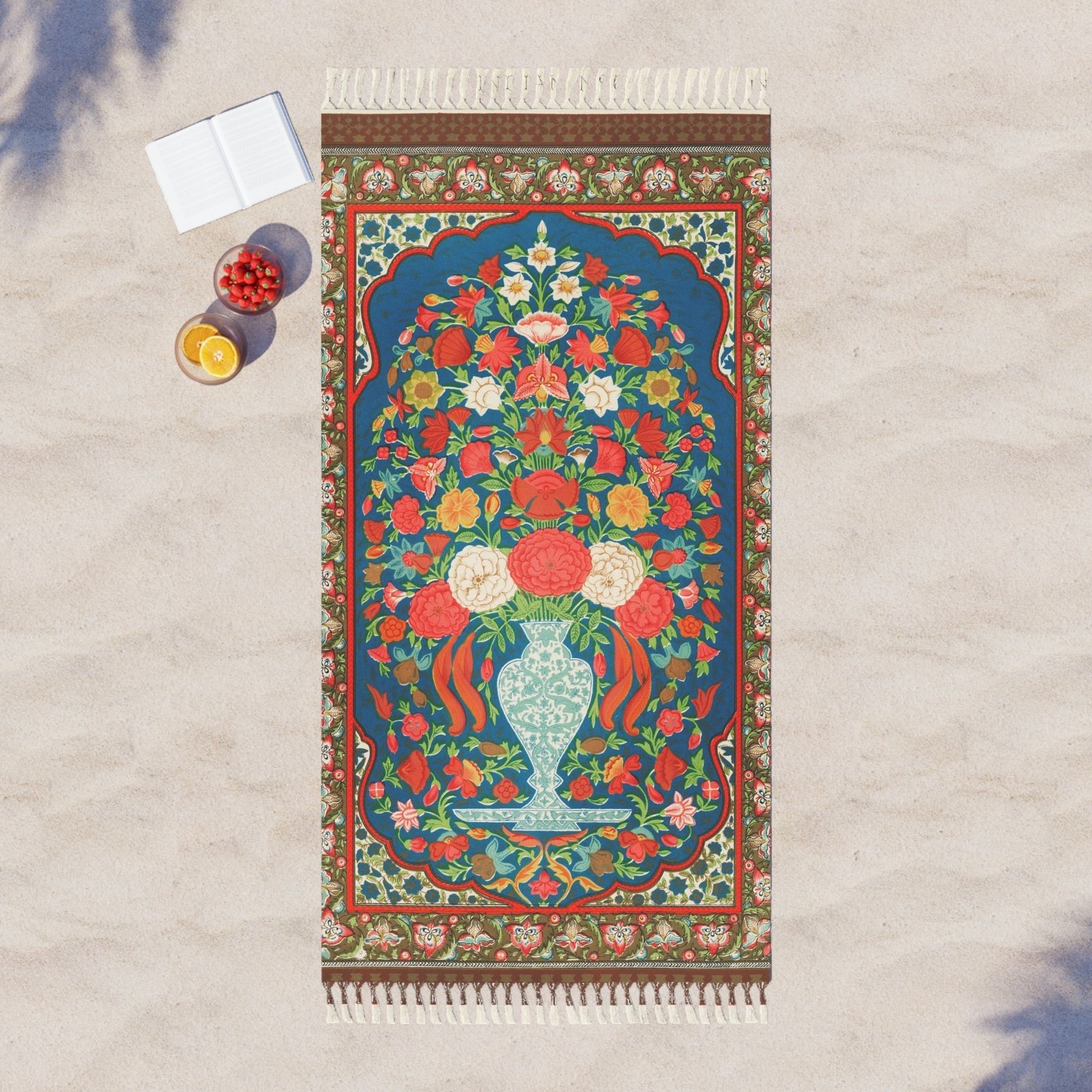 Soft, airy and full of wanderlust — this boho beach cloth brings a vintage-inspired floral tapestry to sand, boardwalks, and impromptu picnics. The vibrant, painterly pattern blooms feel sun-warmed and a little romantic. Light and quick-drying, it slips into a tote or roll-up bag and becomes a towel, sarong, picnic blanket, or lightweight throw for cooler evenings. Knotted tassels trim the edges, adding handcrafted charm and movement when the ocean breeze catches it. Lay it down, wrap up in it, or drape it over a chair — it’s the kind of piece that turns small moments into little rituals of color and calm.