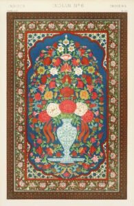 He rose to prominence with his studies of Islamic decoration at the Alhambra, and the associated publication of his drawings, which pioneered new standards in chromolithography. Jones was a pivotal figure in the formation of the South Kensington Museum (later to become the Victoria and Albert Museum) through his close association with Henry Cole, the museum’s first director, and another key figure in 19th century design reform. Jones was also responsible for the interior decoration and layout of exhibits for the Great Exhibition building of 1851, and for its later incarnation at Sydenham. Jones advised on the foundation collections for the South Kensington museum, and formulated decorative arts principles which became teaching frameworks for the Government School of Design, then at Marlborough House. These design propositions also formed the basis for his seminal publication, The Grammar of Ornament, the global and historical design sourcebook for which Jones is perhaps best known today.[3]