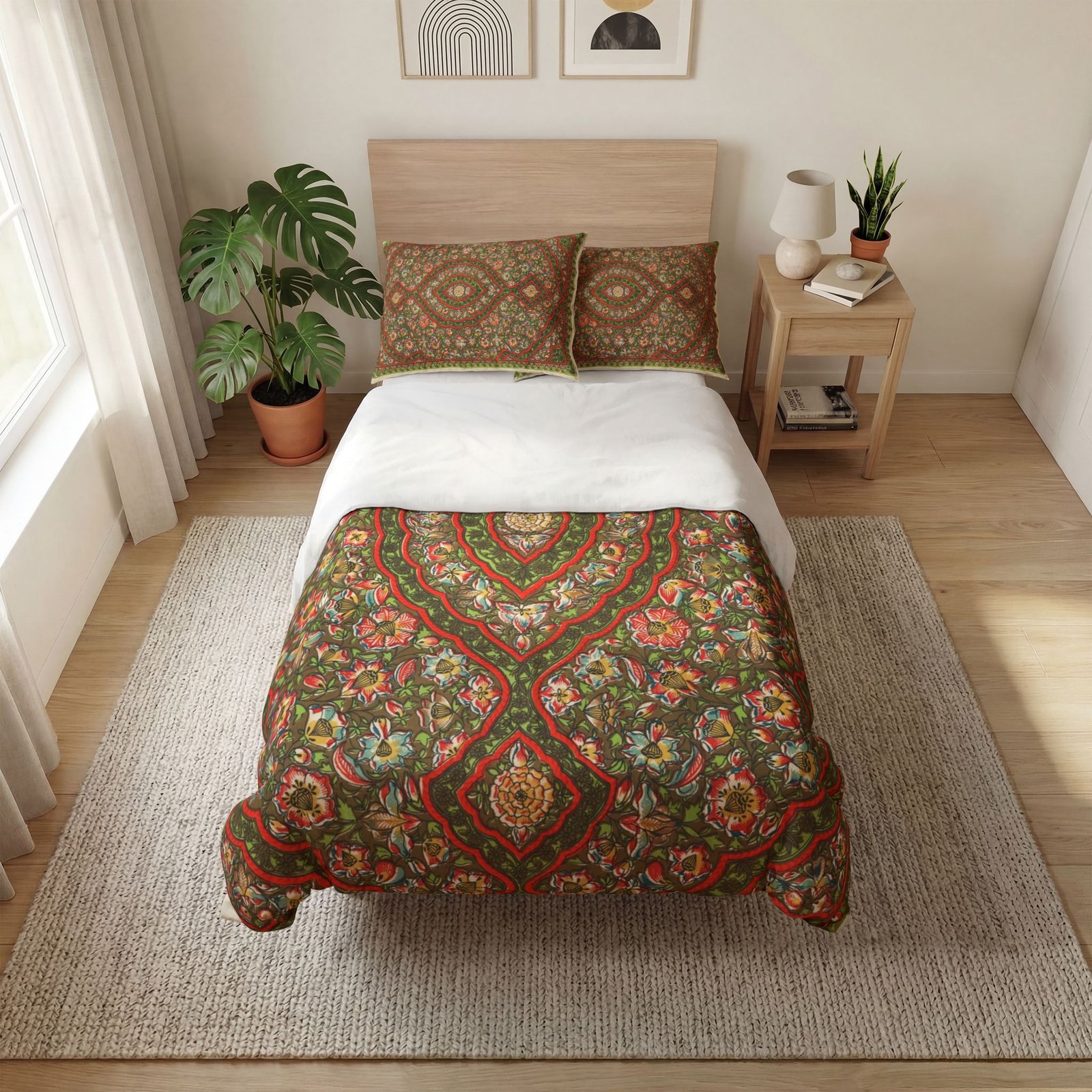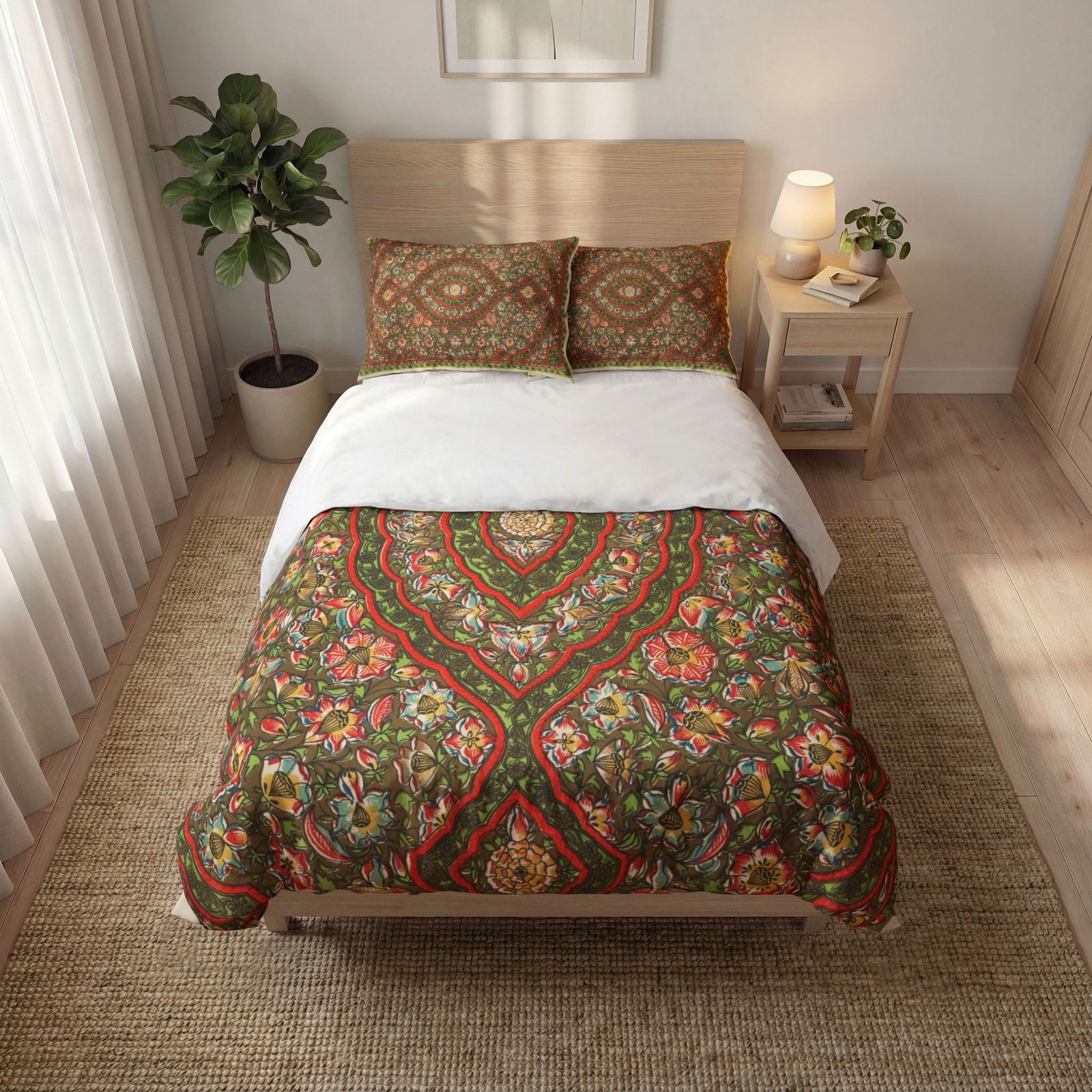 This three-piece quilt cover set features lightweight polyester that drapes easily across the bed and holds crisp printed detail, while serrated cuffs and a color-matched hidden zipper keep the look tidy night after night. Two matching pillow covers share the same design and scale to create a cohesive, layered retreat that feels lived-in and calming. This set suits small master bedrooms or guest rooms where a vibrant palette is wanted for restful evenings and slow mornings.