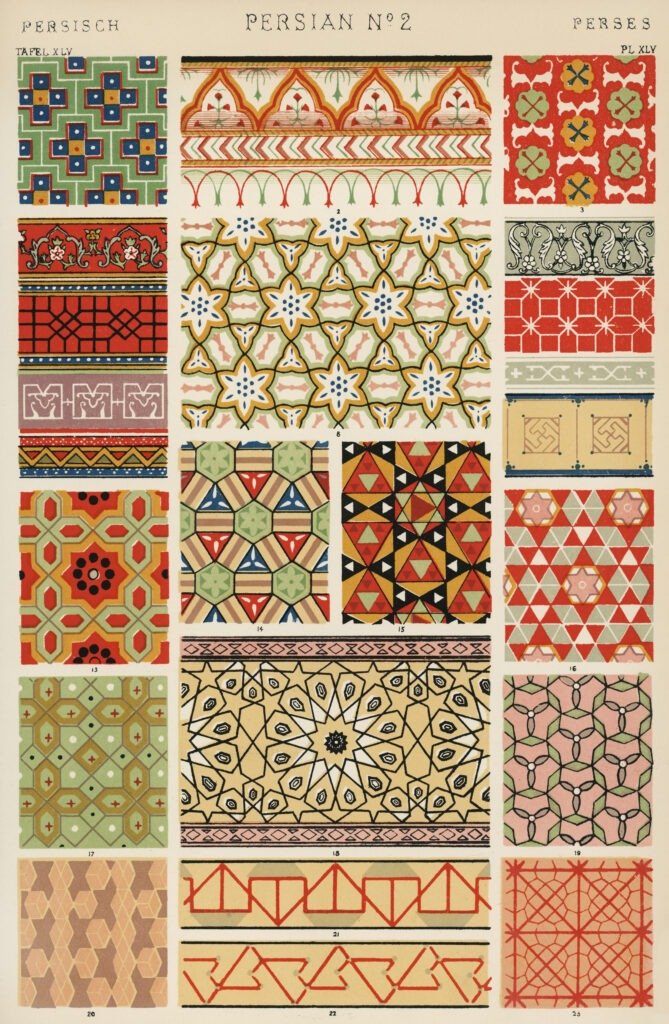 “Persian No. 2” is a prominent chromolithograph plate (often Plate XLV) from Owen Jones‘s seminal 1856 work, The Grammar of Ornament. It showcases intricate 16th and 17th-century Persian decorative motifs, featuring detailed floral and geometric patterns typical of Islamic art, reproduced using advanced color lithography. [1, 2, 3, 4, 5]