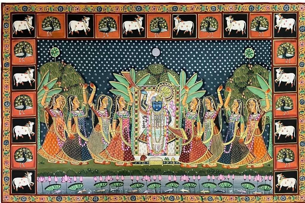 Pichwai painting is a form of traditional Indian art that originates from the state of Rajasthan. These paintings, which portray the life and tales of Lord Krishna, are renowned for their minute details and vivid colours. Accordingly, these paintings were initially made to serve as the background for Lord Shirnathji. He is a manifestation of Lord Krishna as a child. These paintings were originally utilised in the Shrinathji temple of Nathdwara.