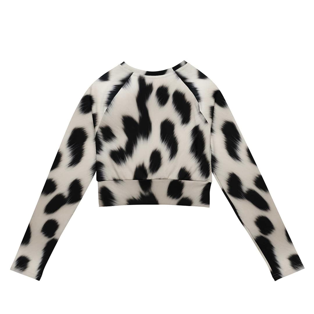 This long-sleeve crop top is made of recycled polyester and elastane, making it an eco-friendly choice for swimming, sports, or athleisure outfits. The crop top has a tear-away care label and a wide, double-layered waistline band for a comfortable fit.