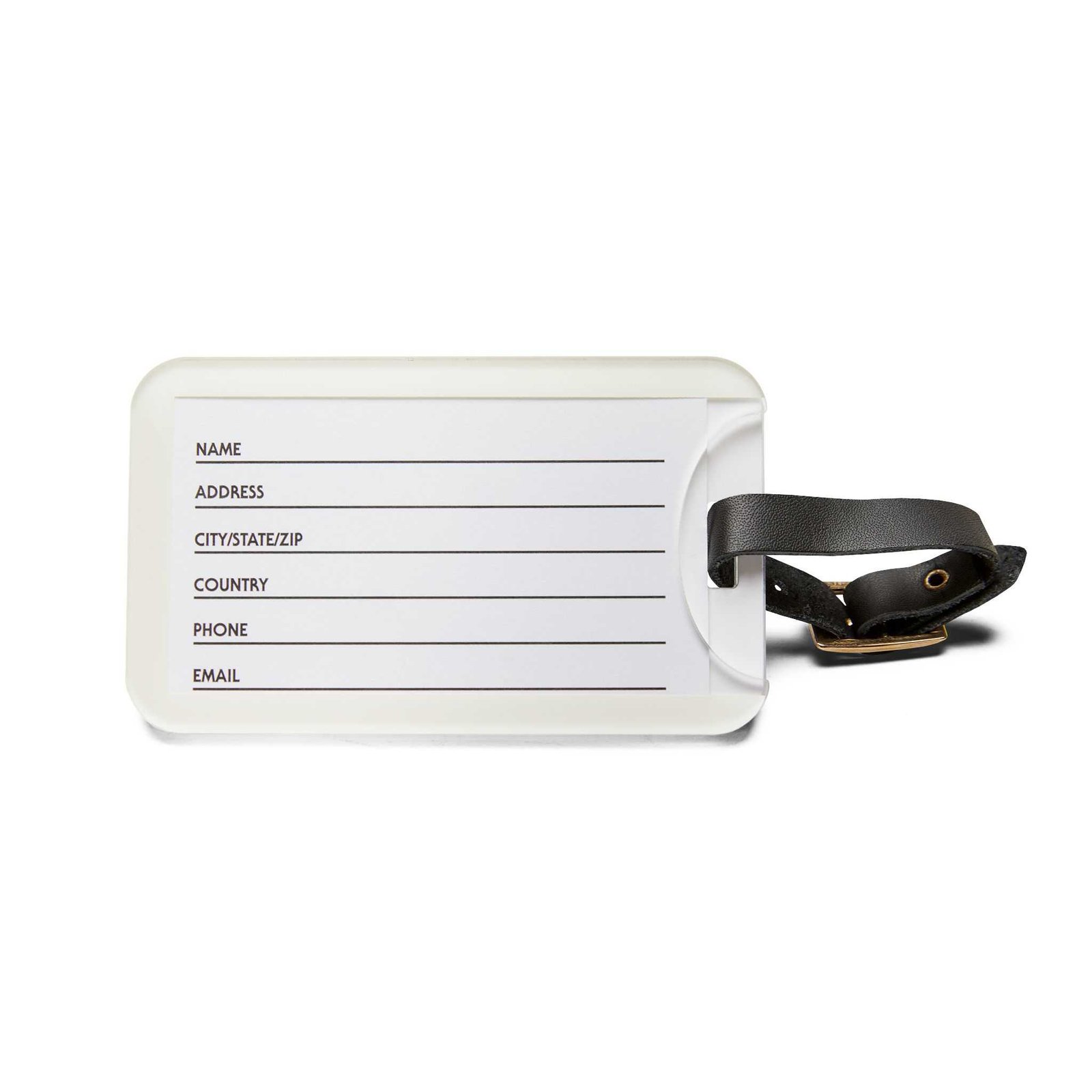 – Includes a rear opening with a space for personal information.