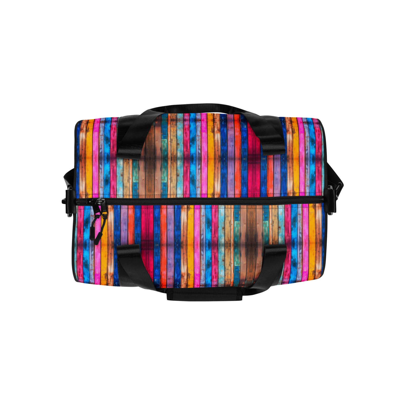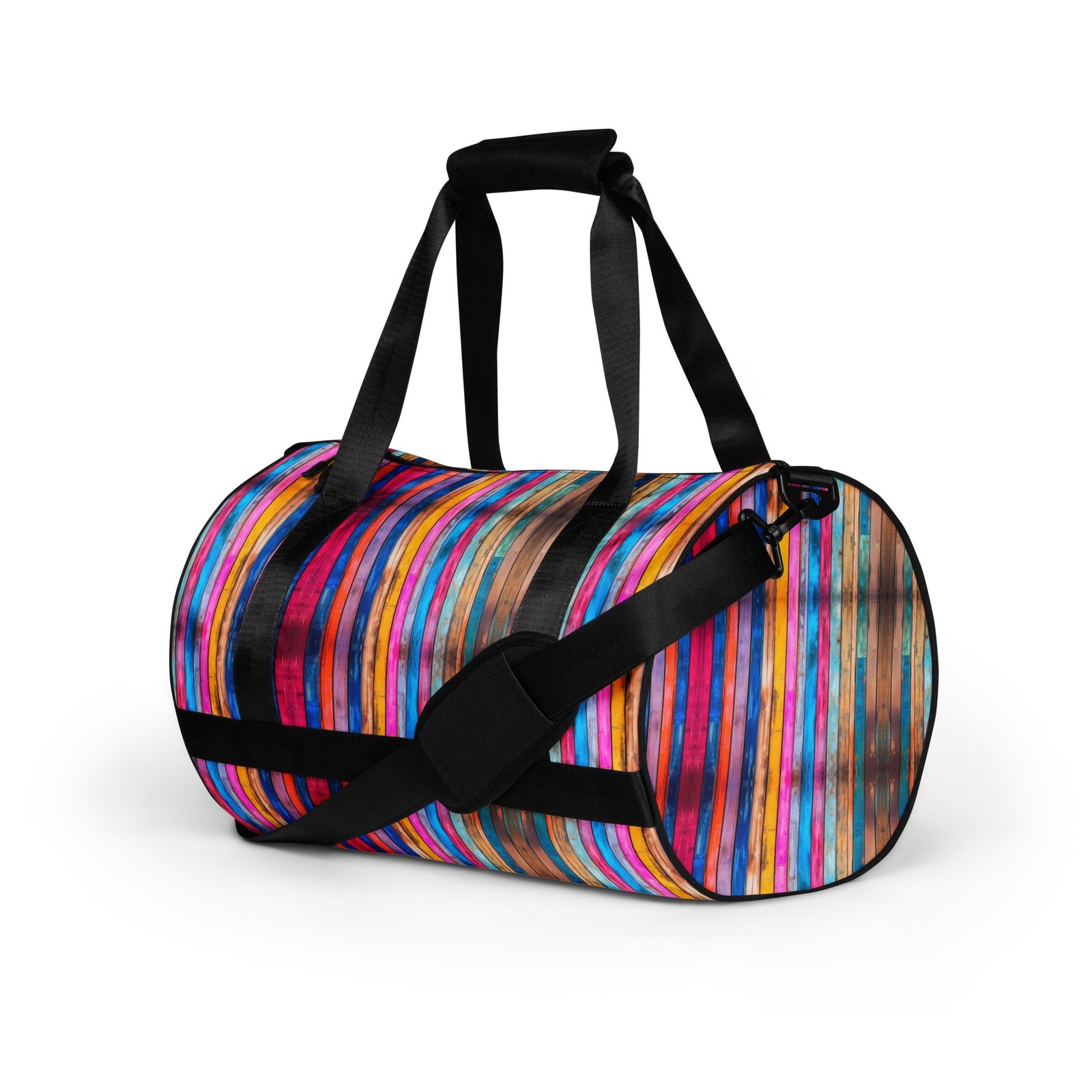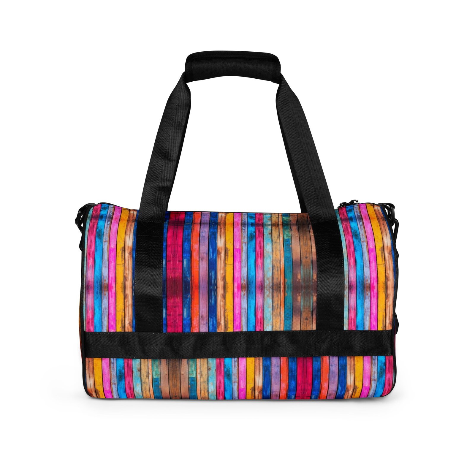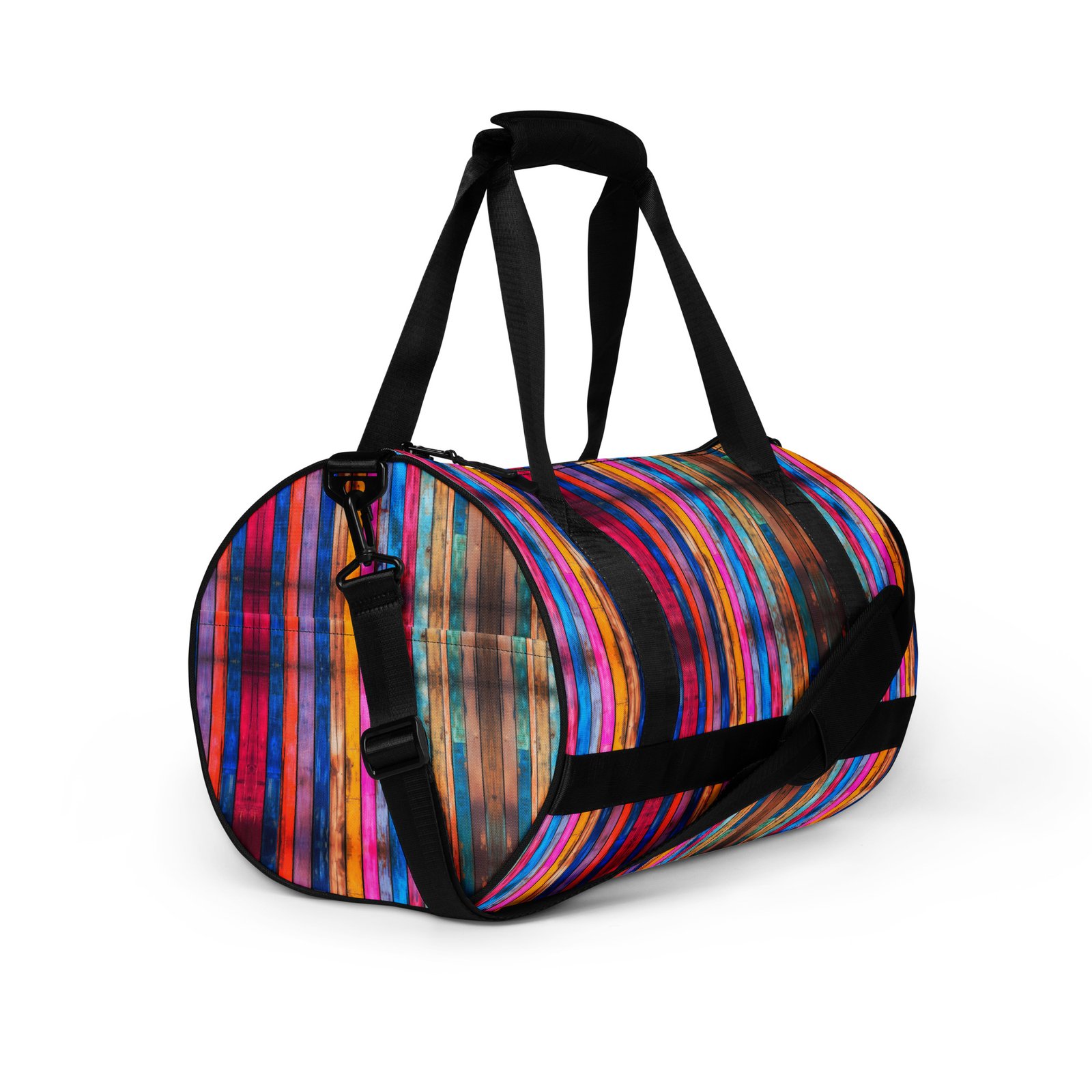 Ready to get your fitness on? Add some punch to pumping iron with this all-over print gym bag. Made from 100% polyester and sturdy, water-resistant fabric, this bag is fun meets function. And it’s got pockets!