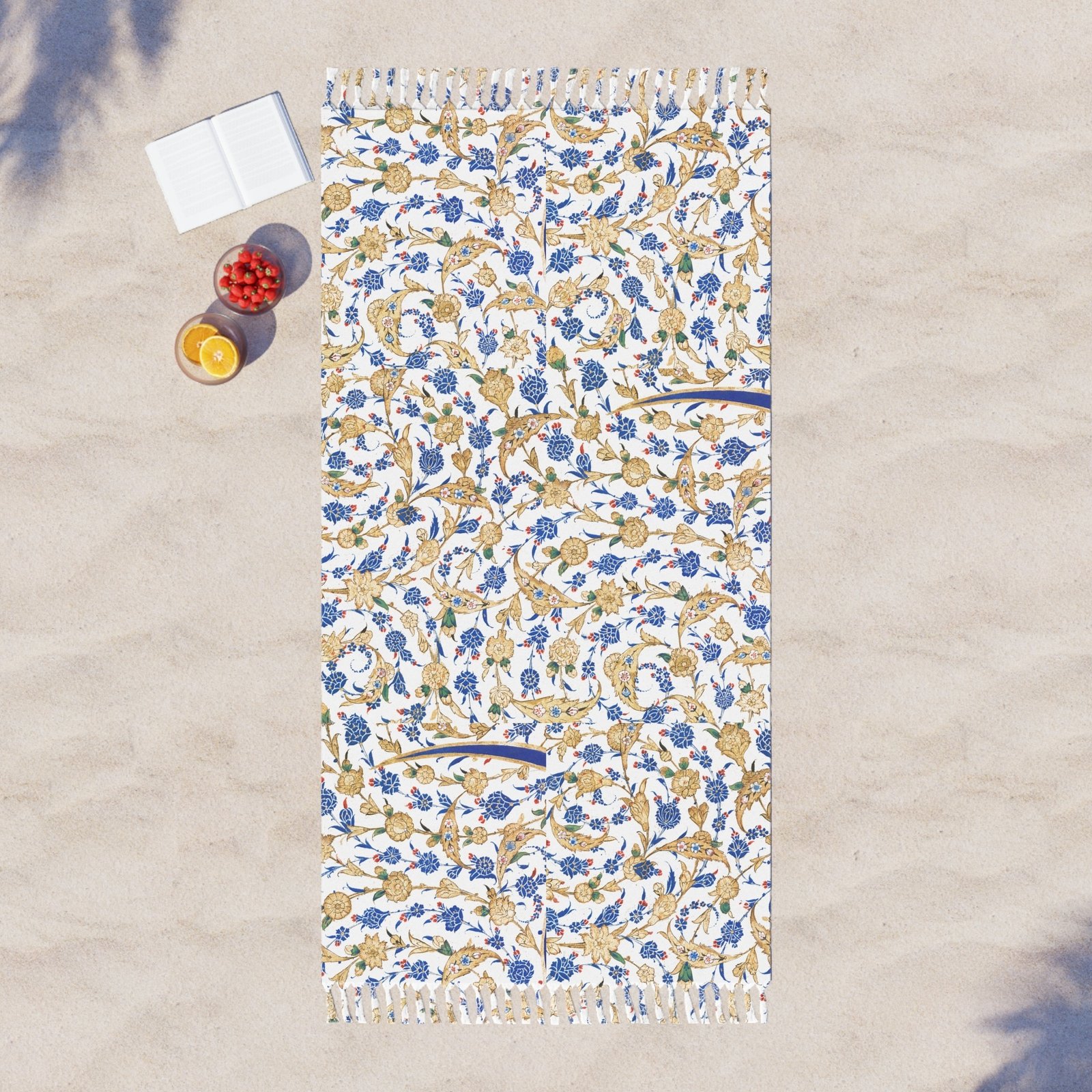 Crafted with meticulous attention to detail, this beach blanket showcases the intricate artistry of Ottoman Turkish design. Every swirl and motif embodies a rich cultural heritage, blending history with style on a single, practical surface.