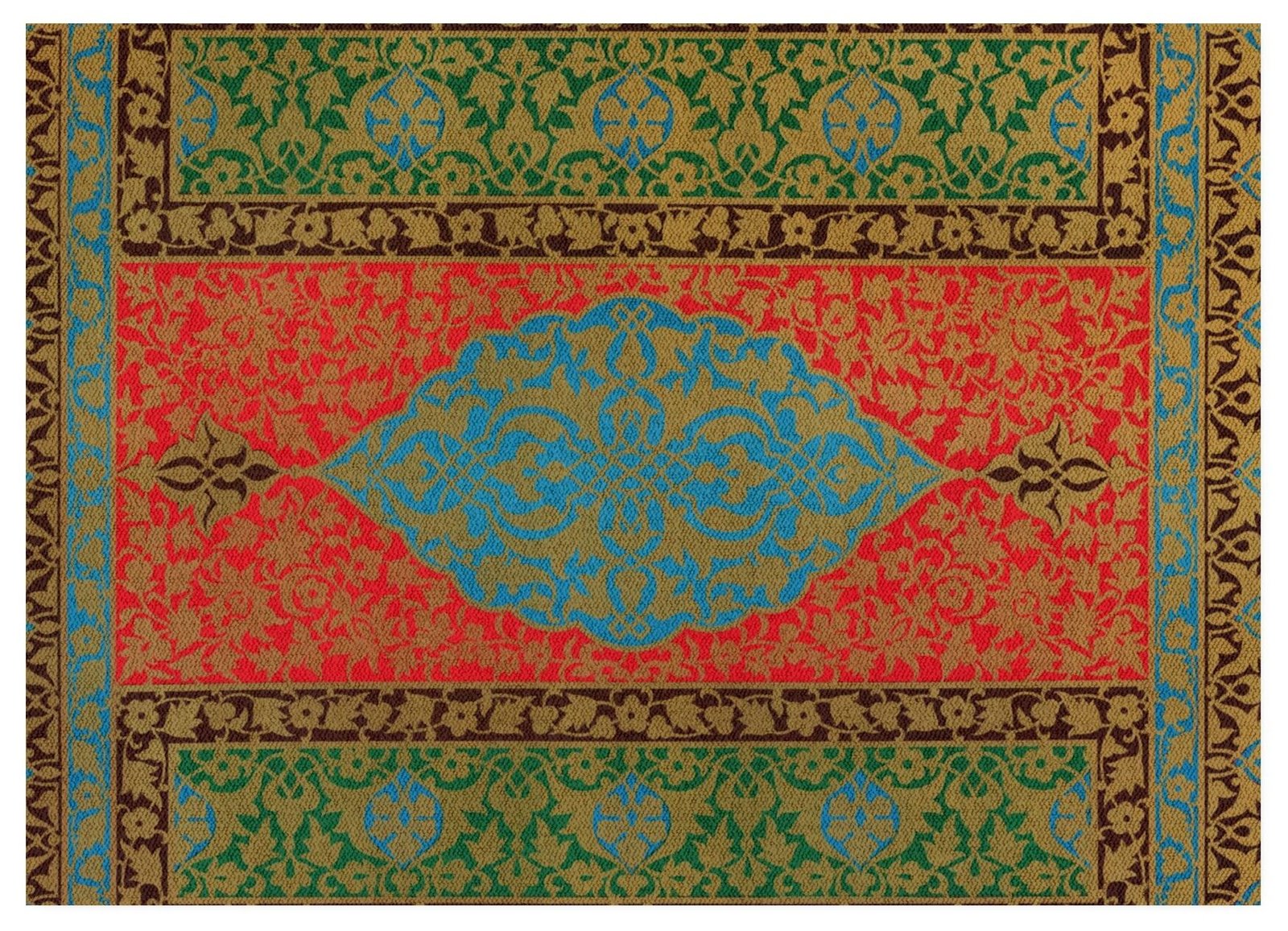 A richly colored polyester rug that brings warm, layered patterning into any room. Deep reds, teals and olive greens form a central medallion and border bands, giving the piece a handwoven appearance with modern durability. The soft pile and hemmed edges create a finished, grounded look underfoot, while the black non-slip backing keeps the rug steady on hardwood or tile. Lightweight and easy to clean, this rug settles into everyday life — from morning coffee routines to late-night reading corners — adding a touch of global-made warmth without heavy maintenance.