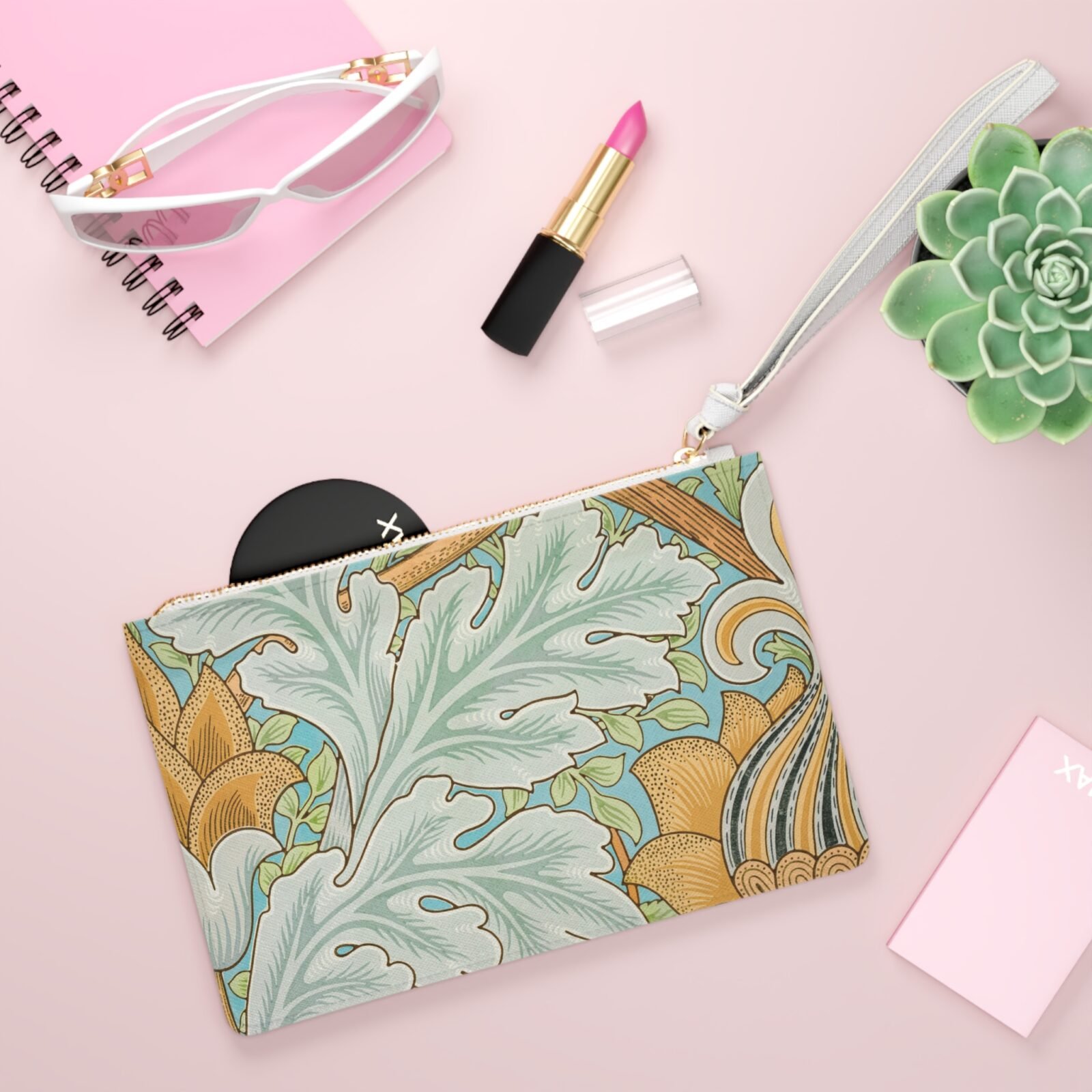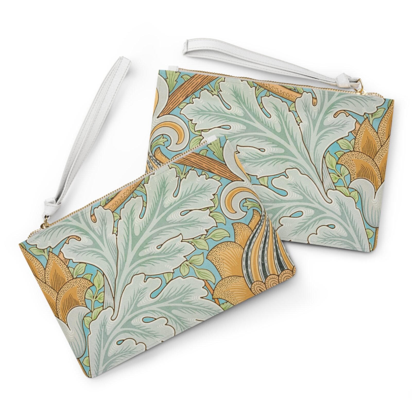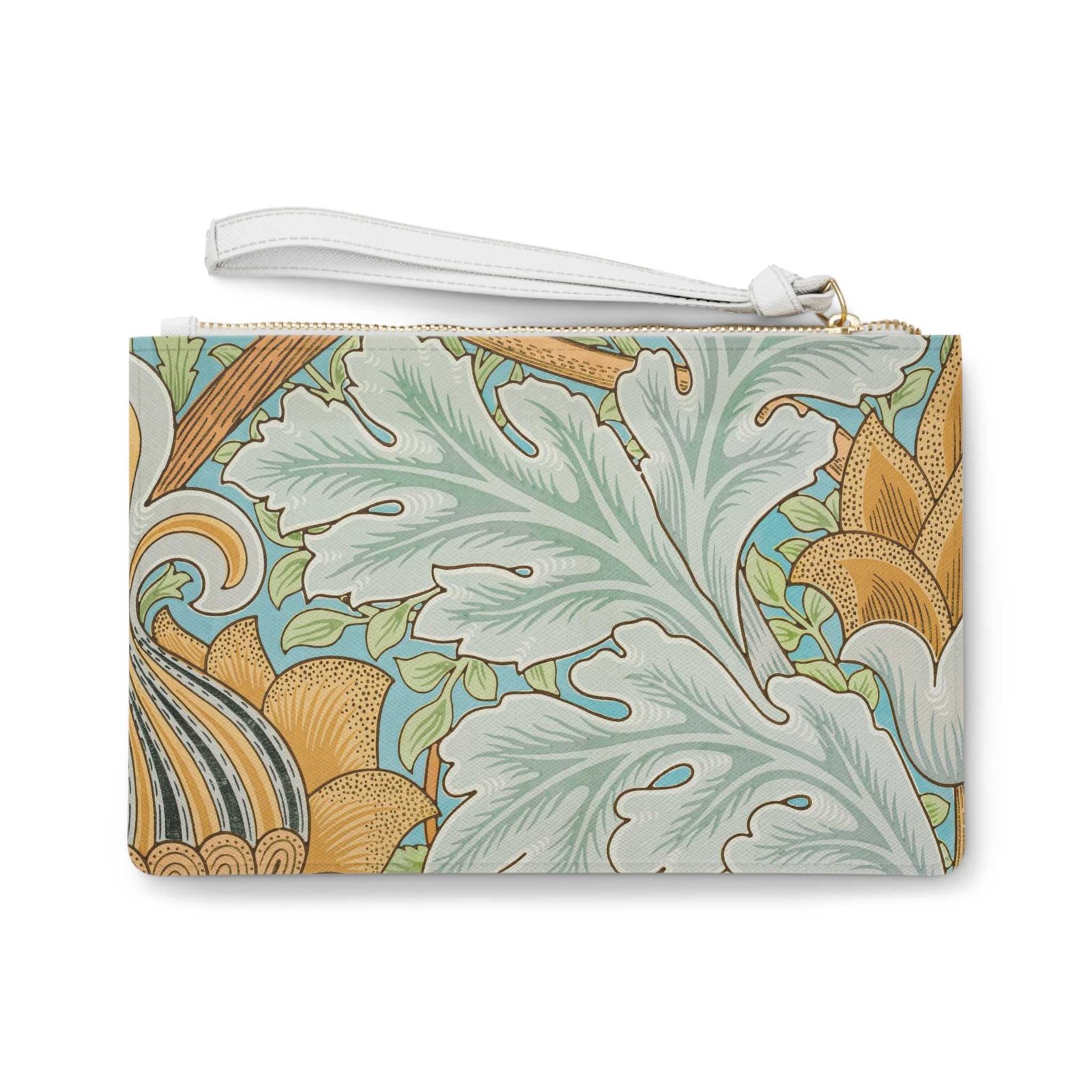 design · floral · arts and crafts · Calmann & King, London, UK / Bridgeman Images Designed with a loop handle to quickly free your hands, this custom clutch bag is made for the fashionista on the go. It can hold everyday essentials such as a phone, wallet, and keys. It features a zip fastening and a fully lined internal pocket. It is made of vegan leather in the Saffiano pattern finish that was invented by Prada.