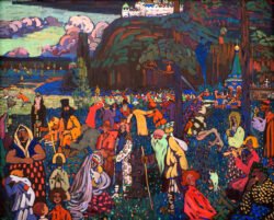 Wassily Kandinsky was a Russian-born painter and art theorist who is widely considered a pioneer of abstract art, known for his spiritual approach to painting and his belief in art’s ability to evoke emotion and inner necessity. He transitioned from a career in law to art in his thirties, moving to Munich to study painting and eventually co-founding the Der Blaue Reiter (The Blue Rider) group with Franz Marc. Kandinsky’s abstract works, which use color, line, and form to convey meaning rather than represent the visible world, were inspired by his love of music and his possible synesthesia (a condition where senses are mixed).