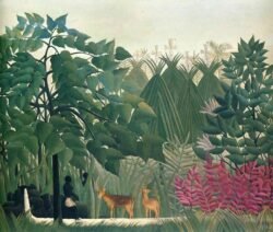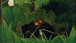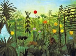 An equally famous work by Rousseau, included in the collection of John Hay Whitney, is Tropical Forest with Monkeys, which was painted during the last months of his life. It shows one of his signature exotic landscapes, lush, tropical, and virgin. Many of the animals in Rousseau’s images have human faces or attributes. The central monkeys in this painting hold green sticks from which strings appear to dangle, suggesting fishing poles and human leisure activities, thereby emphasizing the quasi-human experience of the animals. In this sense Rousseau’s anthropomorphized primates can be seen not as true wild beasts, but rather as representing an escape from the “jungle” of Paris and the everyday grind of civilized life.[15]