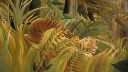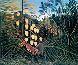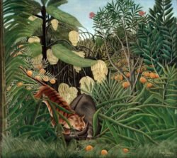 From 1886, he exhibited regularly in the Salon des Indépendants, and, although his work was not placed prominently, it drew an increasing following over the years. Tiger in a Tropical Storm (Surprised!) was exhibited in 1891, and Rousseau received his first serious review when the young artist Félix Vallotton wrote: “His tiger surprising its prey ought not to be missed; it’s the alpha and omega of painting.” Yet it was more than a decade before Rousseau returned to depicting his vision of jungles.[4]