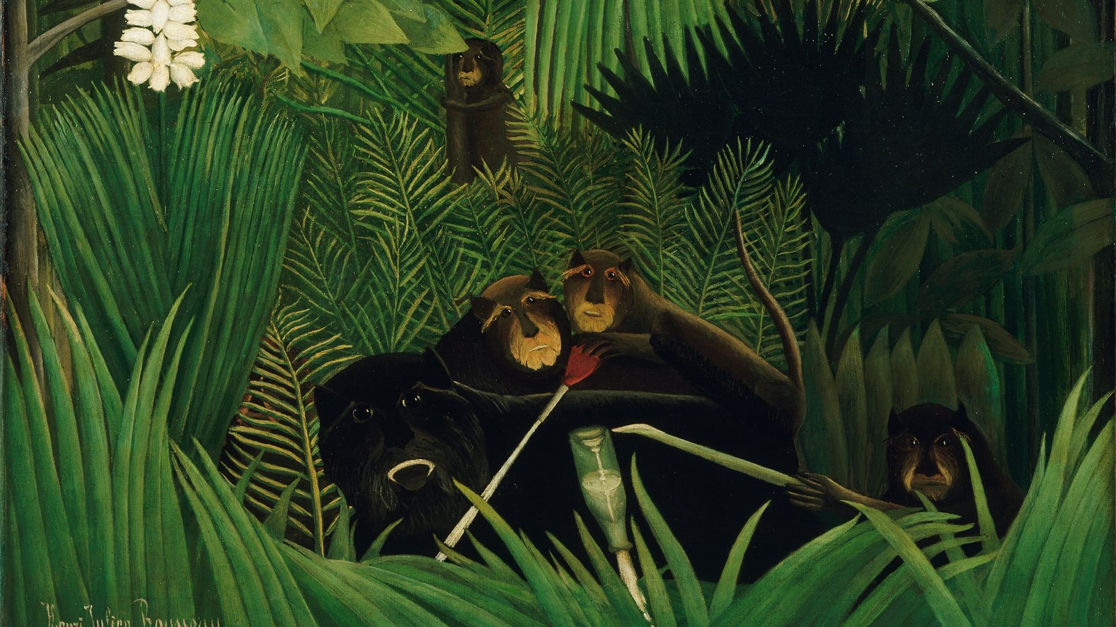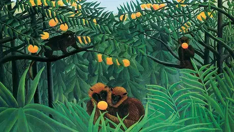 An equally famous work by Rousseau, included in the collection of John Hay Whitney, is Tropical Forest with Monkeys, which was painted during the last months of his life. It shows one of his signature exotic landscapes, lush, tropical, and virgin. Many of the animals in Rousseau’s images have human faces or attributes. The central monkeys in this painting hold green sticks from which strings appear to dangle, suggesting fishing poles and human leisure activities, thereby emphasizing the quasi-human experience of the animals. In this sense Rousseau’s anthropomorphized primates can be seen not as true wild beasts, but rather as representing an escape from the “jungle” of Paris and the everyday grind of civilized life.[15]