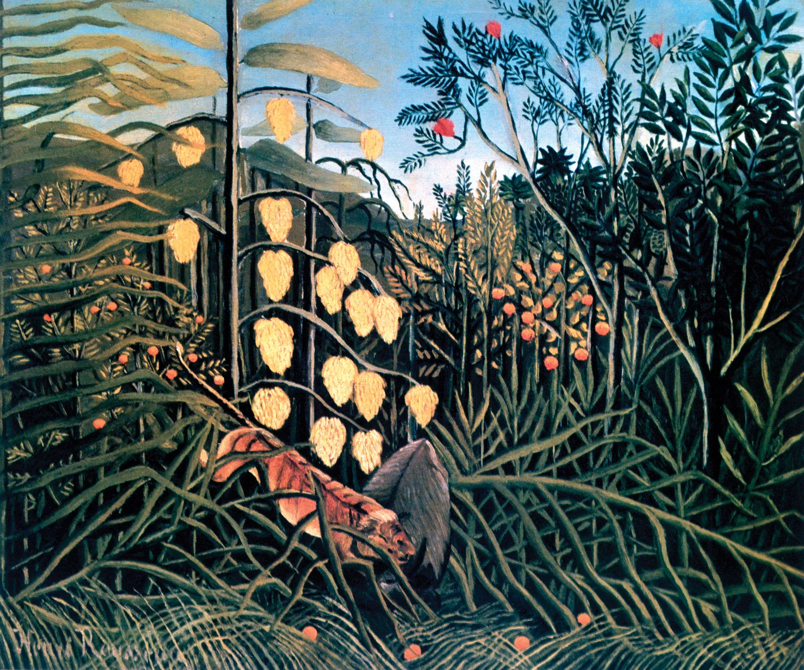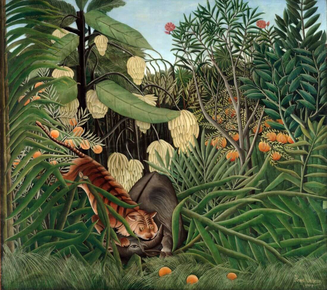 From 1886, he exhibited regularly in the Salon des Indépendants, and, although his work was not placed prominently, it drew an increasing following over the years. Tiger in a Tropical Storm (Surprised!) was exhibited in 1891, and Rousseau received his first serious review when the young artist Félix Vallotton wrote: “His tiger surprising its prey ought not to be missed; it’s the alpha and omega of painting.” Yet it was more than a decade before Rousseau returned to depicting his vision of jungles.[4]