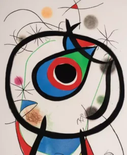 In 1939, with Germany’s invasion of France looming, Miró relocated to Varengeville in Normandy, and on 20 May of the following year, as Germans invaded Paris, he narrowly fled to Spain (now controlled by Francisco Franco) for the duration of the Vichy Regime’s rule. In Varengeville, Palma, and Mont-roig, between 1940 and 1941, Miró created the twenty-three gouache series Constellations. Revolving around celestial symbolism, Constellations earned the artist praise from André Breton, who seventeen years later wrote a series of poems, named after and inspired by Miró’s series. Features of this work revealed a shifting focus to the subjects of women, birds, and the moon, which would dominate his iconography for much of the rest of his career.