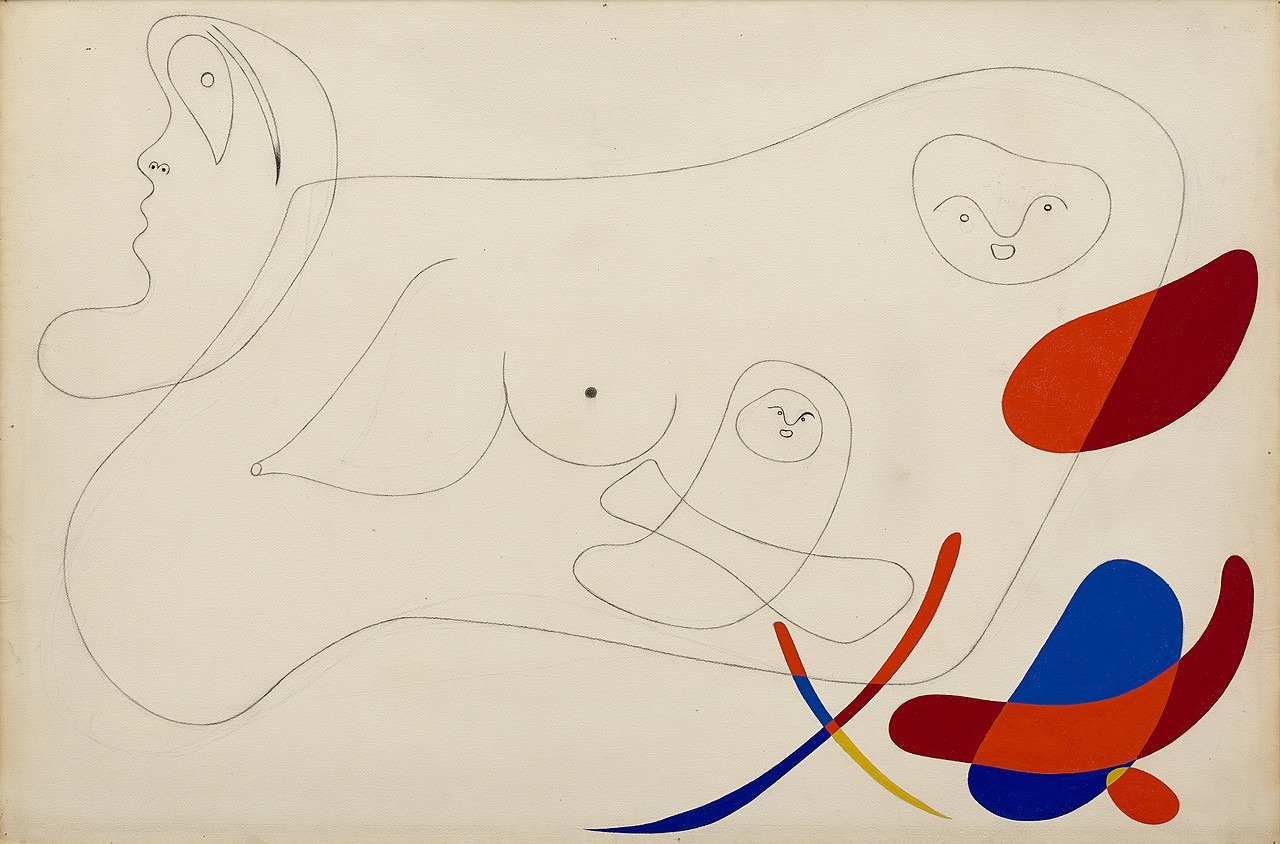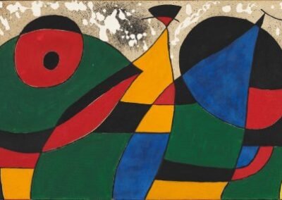 In 1939, with Germany’s invasion of France looming, Miró relocated to Varengeville in Normandy, and on 20 May of the following year, as Germans invaded Paris, he narrowly fled to Spain (now controlled by Francisco Franco) for the duration of the Vichy Regime’s rule. In Varengeville, Palma, and Mont-roig, between 1940 and 1941, Miró created the twenty-three gouache series Constellations. Revolving around celestial symbolism, Constellations earned the artist praise from André Breton, who seventeen years later wrote a series of poems, named after and inspired by Miró’s series. Features of this work revealed a shifting focus to the subjects of women, birds, and the moon, which would dominate his iconography for much of the rest of his career.