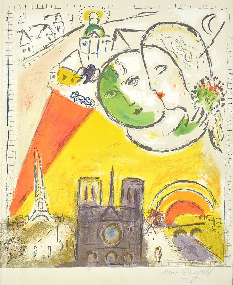Visiting Russia in 1914, the artist was prevented from returning to Paris due to the outbreak of World War I until 1926. In addition to his paintings, Chagall was also noted for his vibrant works in stained glass and lithography. Forced to flee Paris during World War II, Chagall lived in the United States and traveled through to Israel before returning to France in 1948. The artist died in Saint-Paul-de-Vence, France on March 28, 1985. Today, his works are held in the collections of The Museum of Modern Art in New York, the Tate Gallery in London, the Tel Aviv Museum of Art, and the Albertina in Vienna, among others.