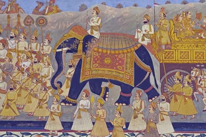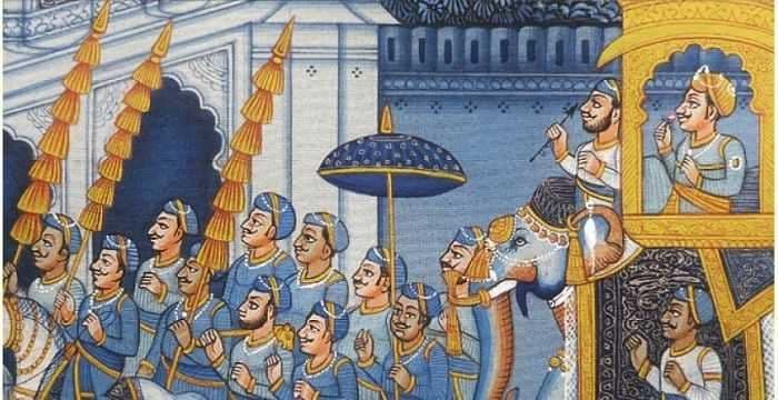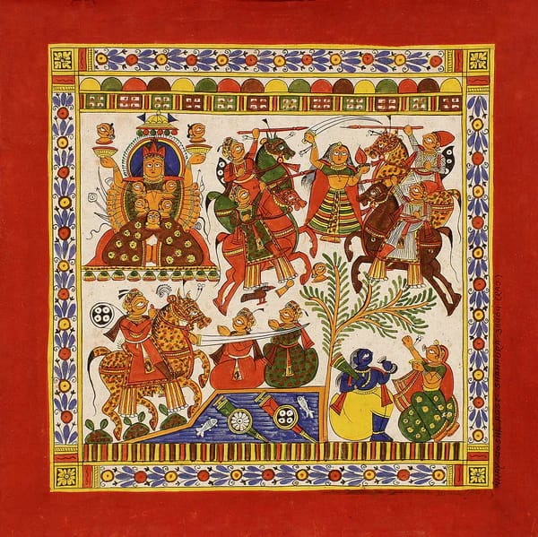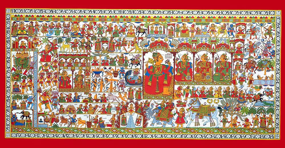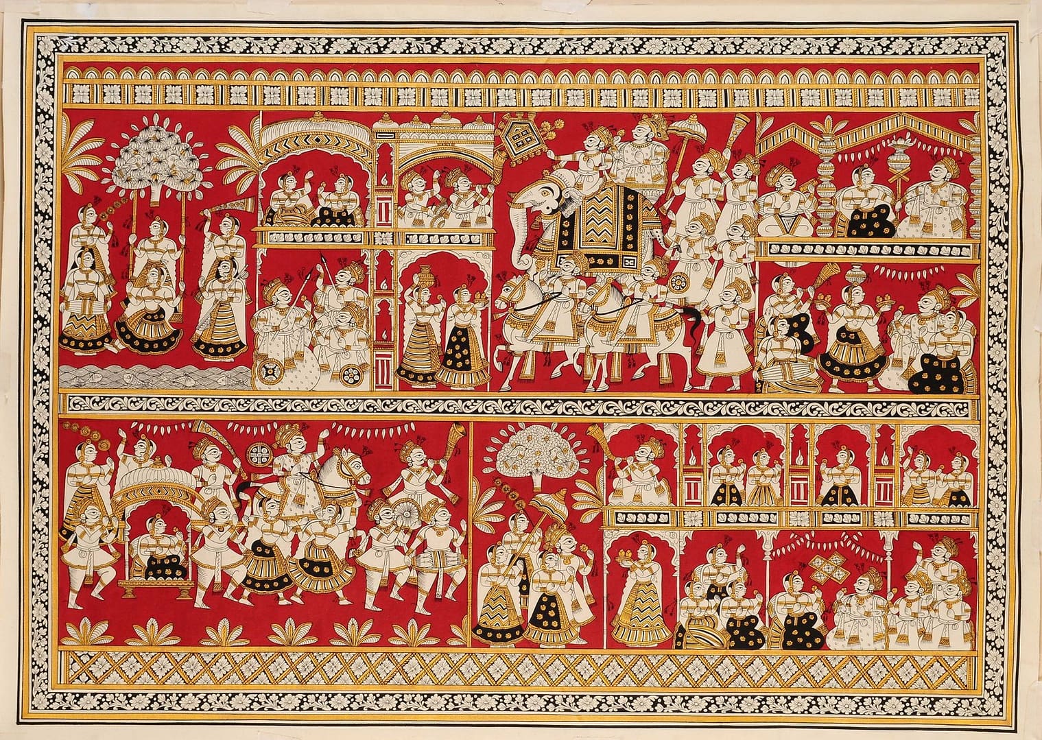 Phad is a traditional Rajasthani scroll painting from India, depicting the stories of local deities, heroic figures from battlefields, adventure stories, and legendary romantic stories on horizontal cloth scrolls with the hues of red, yellow, and bright orange. Phad Painting marvellously portrays multiple stories in a single composition and beautifully maintains the aesthetics of artistic expression.