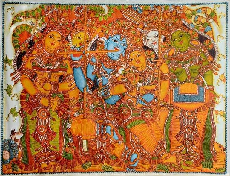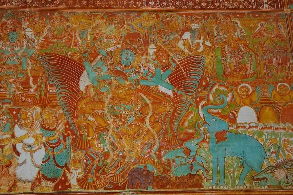 Kerala mural paintings are the most unique art form and have deep spiritual roots depicting themes of Hindu mythologies, epics of the bye-gone era, classic tales of Krishna, and mystic forms of Shiva and Shakti. These traditional art styles are made up of bold strokes, and vivid colours. White, ochre-red, bluish-green, yellow-ochre, and pure colours are predominantly used in Kerala mural painting.