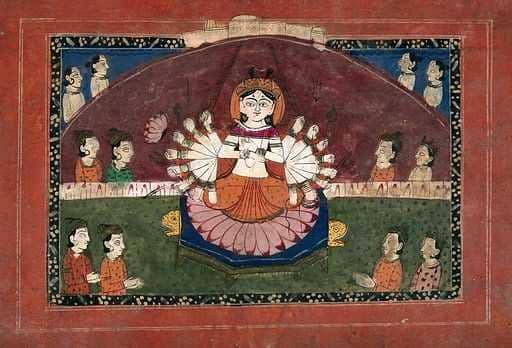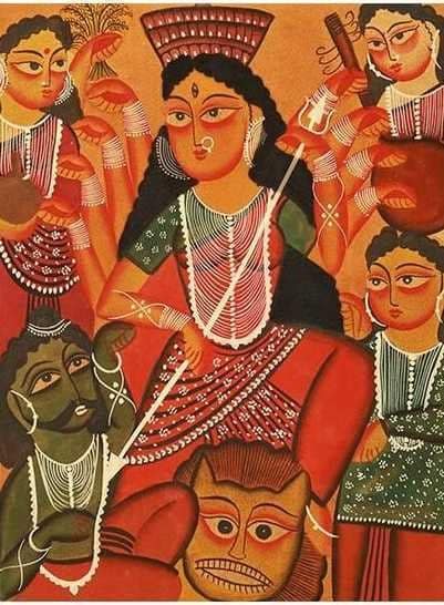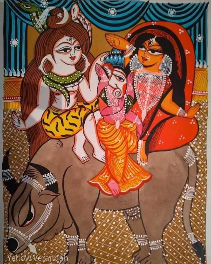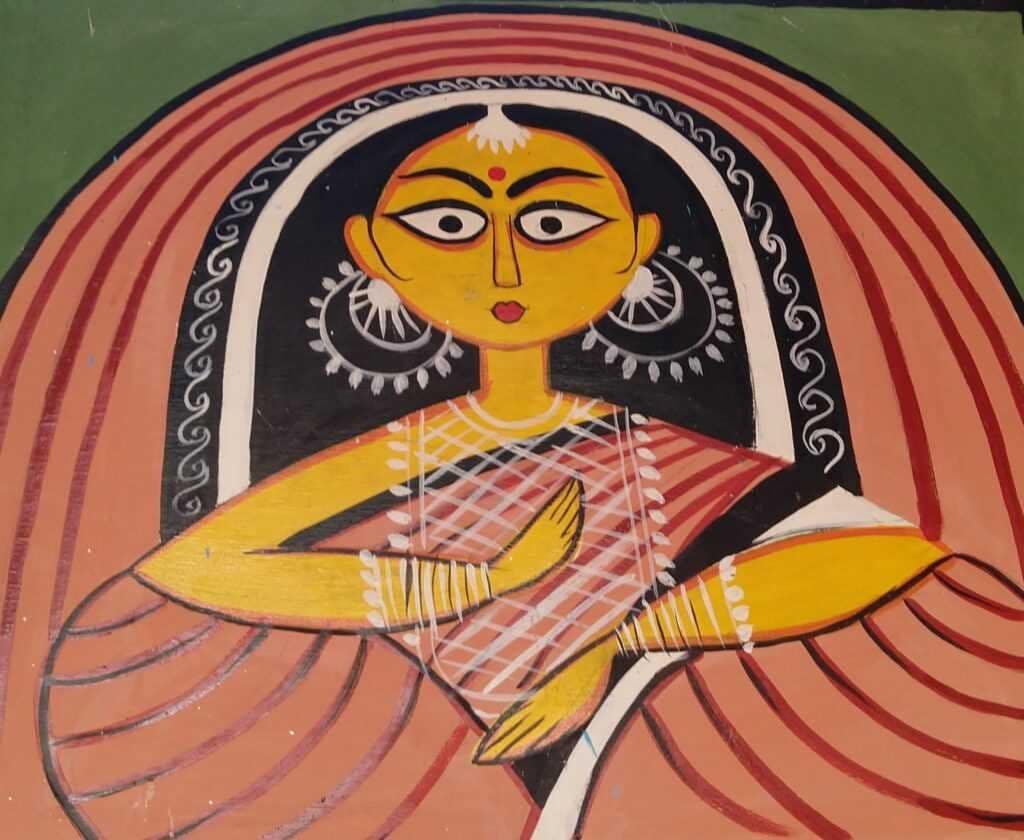 The Kalighat painting was discovered around the mid-19th century at Kali Temple in Calcutta. These paintings and drawings were done on paper by a community known as “patuas”. A Kalighat painting depicts scenes of everyday life and mythological deities in a captivating manner. Kalighat artists use subtle earthy Indian colours like indigo, ochre, Indian red, grey, blue and white.