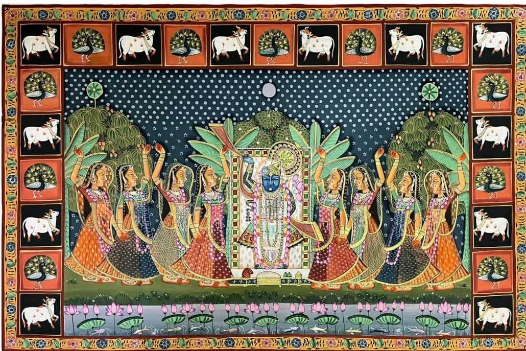Picchwai artwork was made as wall hangings behind the main deity in Krishna temples in Nathdwara which narrates the stories related to Lord Krishna. Picchwais are the most colorful and intricate work concealed with symbolism in the artistic motifs. This classified devotional art practice has passed from one generation to another and a fine example of spirituality in art.