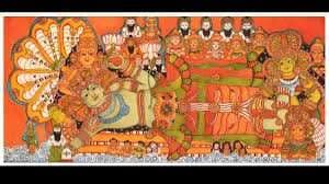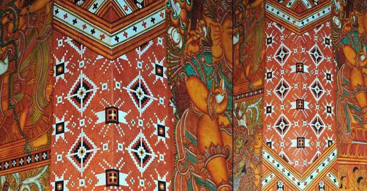 The scriptural basis of these paintings can be found in the Sanskrit texts, Chithrasoothram – (Chitrasutra is a part of the Vishnu Dharmottara Purana, a book written in Sanskrit about 1500 years ago. It contains 287 short verses in nine chapters and a few prose in the second chapter. There is no other book on painting as detailed as the Chitrasutra. This book answers hundreds of questions about what a painting is, why, its purpose, role, relationship with the painter, connoisseurs, and other arts. Chitrasutra will be useful to understand the true Indian painting.)Tantrasamuchaya, the fifteenth century text authored by Narayanan, Abhilashitartha Chintamani of the twelfth century and Silparatna by Sreekumaran of the sixteenth century.[1] Iconography of the mythological character in murals are based on the Dhyanaslokas.[2]