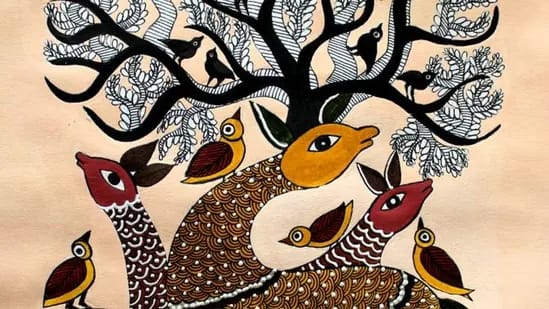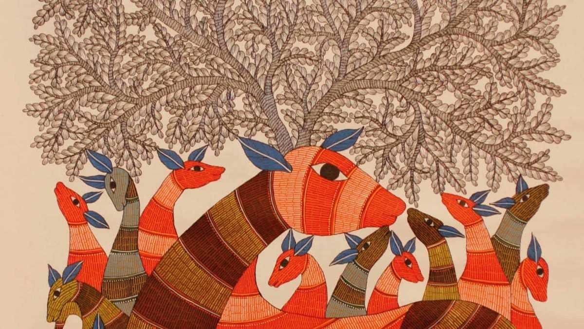 Gond paintings are a series of arranged dots and dashes developed by the Gondi tribe of central India. The tribes used to recreate some famous epic mythological tales of histories to traditional songs and rituals with rich detailing and bright colours. Traditionally, the colours used for gond paintings were derived from natural resources like cow dung, plant sap, charcoal, coloured soil, mud, flowers, leaves, etc. With growing times, the Gond art has moved beyond being a tribal art style.