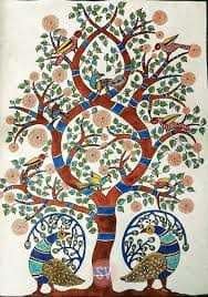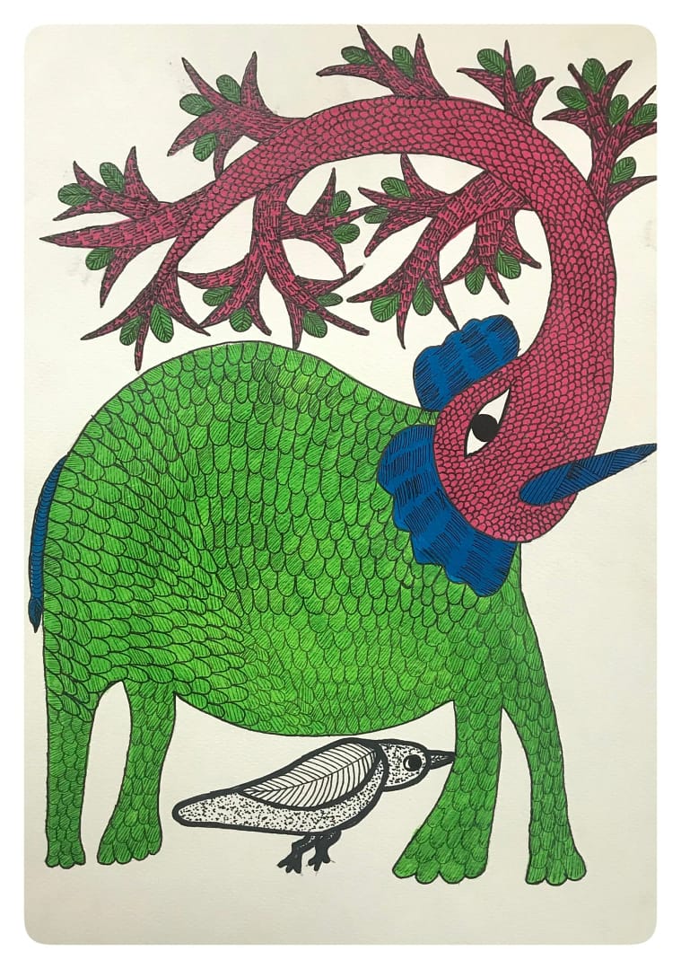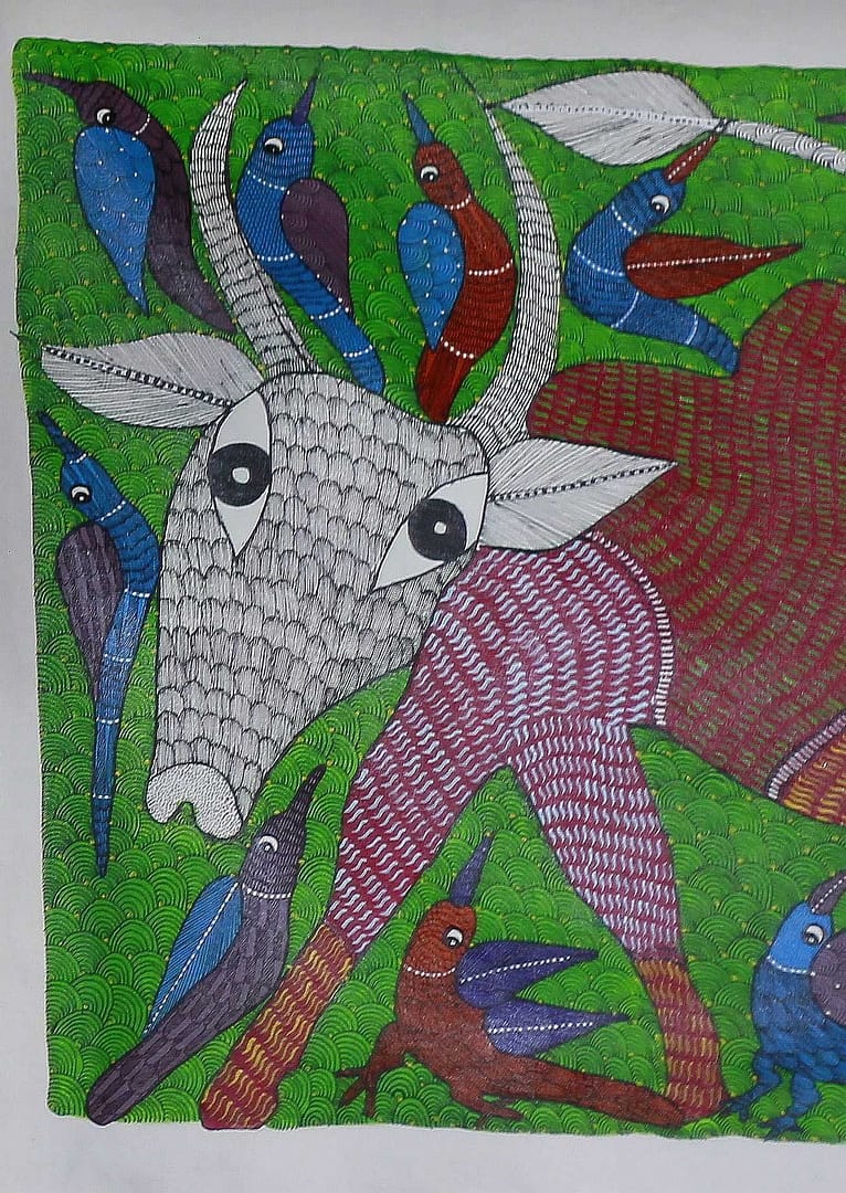 Gond Painting is a tribal art form practiced by Gond Tribes of Central India. Gond are Dravidian and the largest Adivasi Community in India. They are predominantly found in Madhya Pradesh but can also be traced in Andhra Pradesh, Maharashtra, Chattisgarh and Odisha. Gond believes that everything is inhabited by a spirit and therefore sacred. Their paintings reflect the close connection between man and the nature. Paintings are created out of carefully drawn lines in such a way that they convey a feeling of movement to the still images. Dots and Dashes are added to make the details and create the feeling of movement. Gond Paintings use vivid and bright colours like White, Yellow, Blue and Red which are derived from natural objects.
