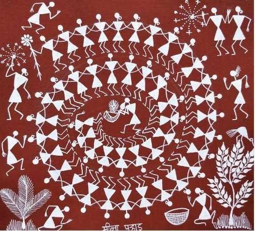 The Warli painting tradition in Maharashtra are among the finest examples of the folk style of paintings. The Warli tribe is one of the largest in India, located outside Mumbai. Till the 1970s, even though the tribal style of art is thought to date back as early as 10th century C.E.[1] The Warli culture is centered on the concept of Mother Nature and elements of nature are often focal points depicted in Warli painting. Farming is their main way of life and a large source of food for the tribe. They greatly respect nature and wildlife for the resources that they provide for life.[2] Warli artists use their clay huts as the backdrop for their paintings, similar to how ancient people used cave walls as their canvases.