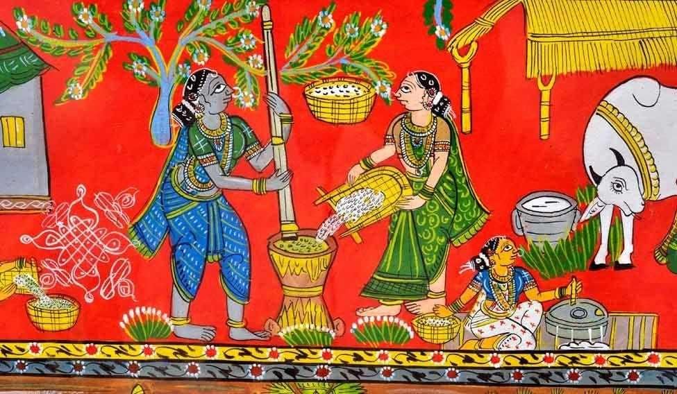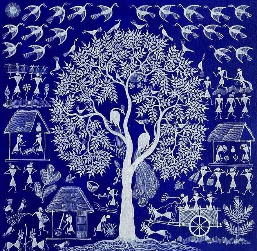 Warli is a 2,500-year-old traditional painting style from Maharashtra majorly practiced in Thane and Nashik region. Warli paintings illustrate the nature and social rituals of the tribe. Warli paintings also showcase day-to-day life scenarios of the local people of that particular community just like dancing, farming, hunting, praying, etc. The local women used twigs to draw such beautiful lively designs with rice paste on mud walls to convey the celebration vibes of harvests or weddings.